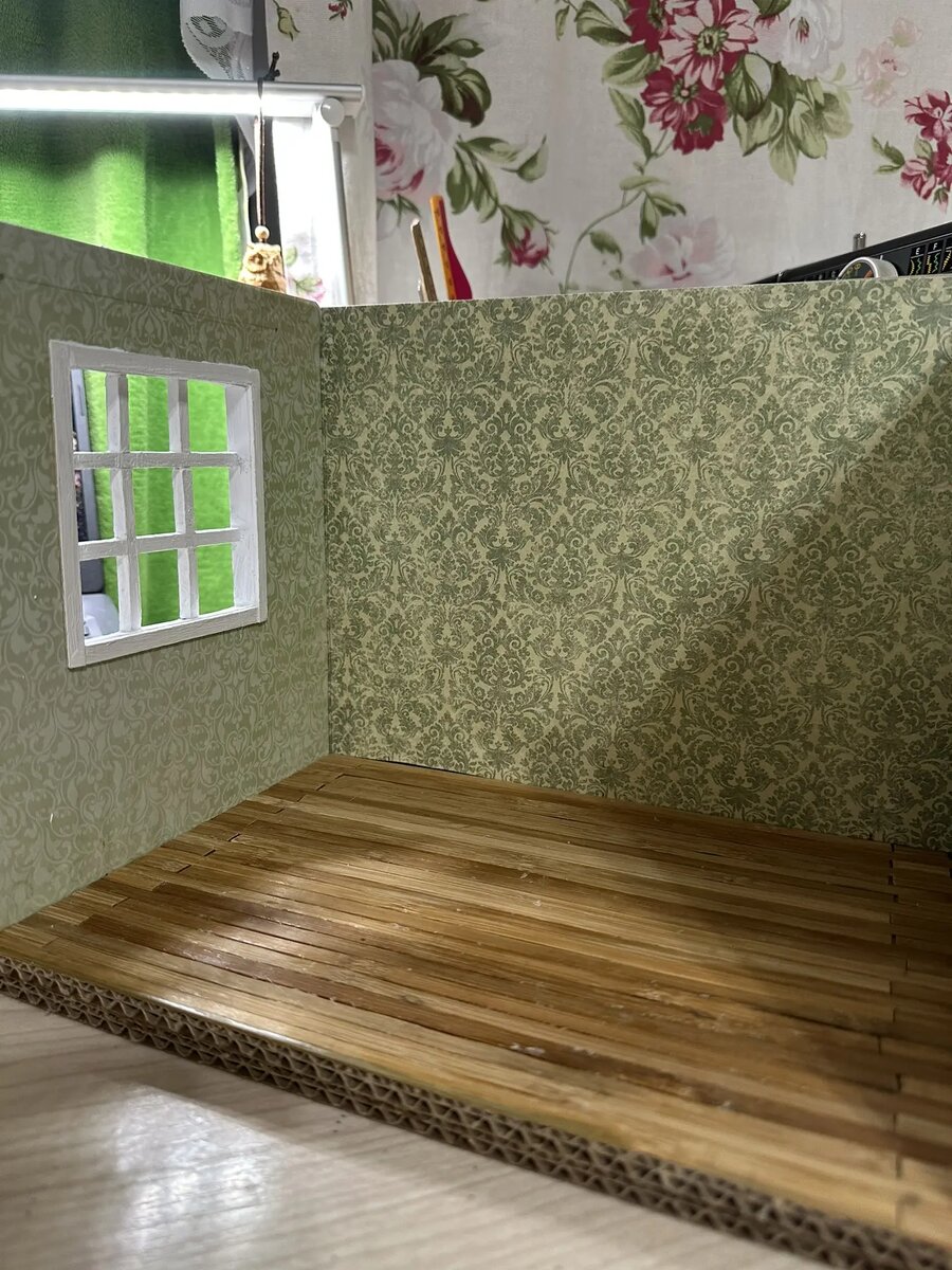 Год назад я вдохновилась идеей сделать для кукол ростом 15 см небольшую комнату. Я решила, что это будет ванная комната в винтажном стиле. Но начала я ее делать только осенью. Первый вариант оказался неудачным - я склеила картон для стен клеем ПВА и их сильно повело. Причем я уже один раз обожглась на этом же самом процессе, но напрочь об этом забыла и повторила ту же ошибку. В итоге стены пришлось выбросить и начать все заново. Второй раз я склеила стены на полимерный клей и сделала их чуть потоньше, чем в первый раз. Этот процесс для меня достаточно муторный - пока листы картона склеишь, пока они высохнут под прессом, пока их обклеишь переплетным картоном перед поклейкой "обоев"... Поэтому хочу в следующий раз попробовать сделать каркас комнаты из пенокартона размером А4. Там будет минимум резки, есть шанс, что стены будут ровнее. Процесс склейки стен тянулся у меня весь февраль, в час по чайной ложке. Вчера наконец дошла очередь до полов. Их я сделала из бамбуковой салфетки под г