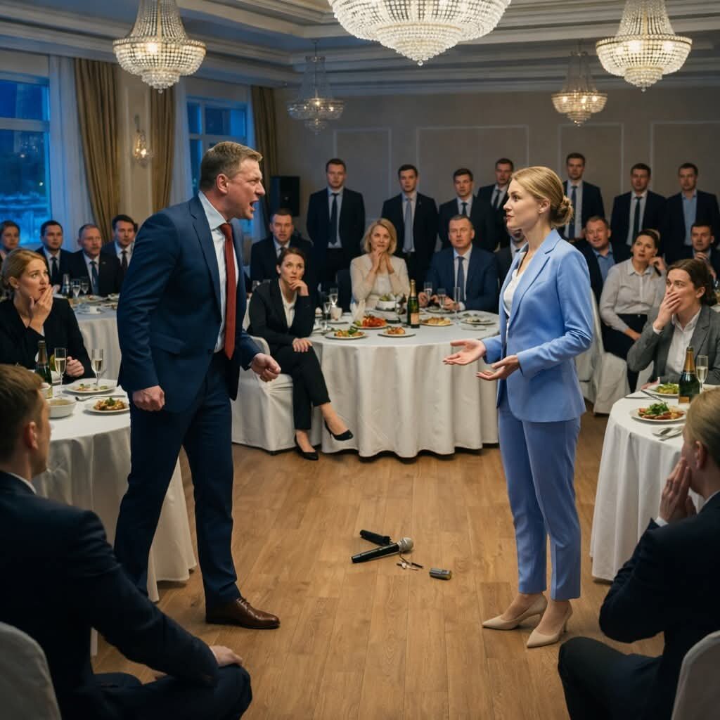 Муж при 23 коллегах вырвал мой микрофон и швырнул об пол: «Молчи, убогая!» Через 11 минут в зал вошёл его новый директор