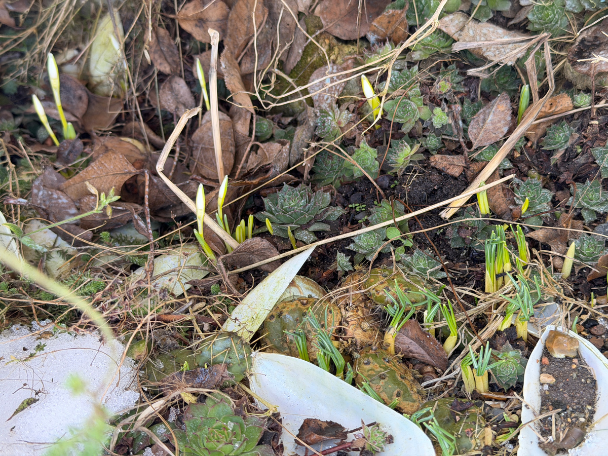 Семпервивумы вечно-живые - ну так им по статусу положено. Как и опунции. Но вот-вот раскроющиеся первые бутоны подснежных галантусов, но эти полные стремительного оптимизма листочки крокусов! И какой-то солидный росток неопознанный в верхнем левом углу снимка!