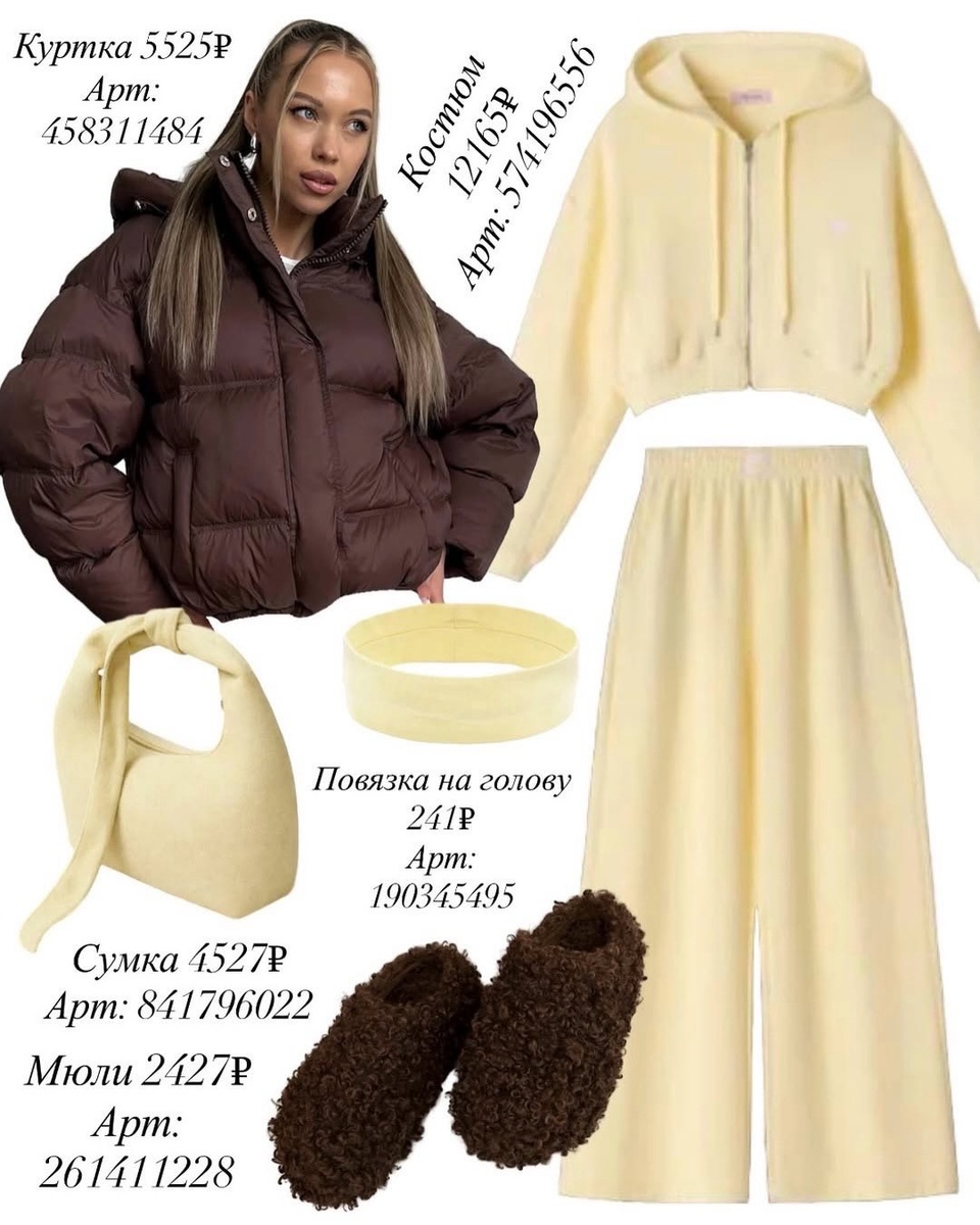 Эта подборка особенно хороша тем, что в ней есть настроение. Она выглядит не просто как набор случайных покупок, а как цельная капсула для прохладной весны, неспешных прогулок, городских выходов, поездок, кофе на вынос и тех дней, когда хочется чувствовать себя уютно, но при этом выглядеть собранно и очень красиво. Светлый трикотажный костюм здесь отвечает за нежность и расслабленность, шоколадная куртка добавляет глубину и контраст, сумка и повязка поддерживают мягкое настроение, а мюли делают образ модным и запоминающимся.