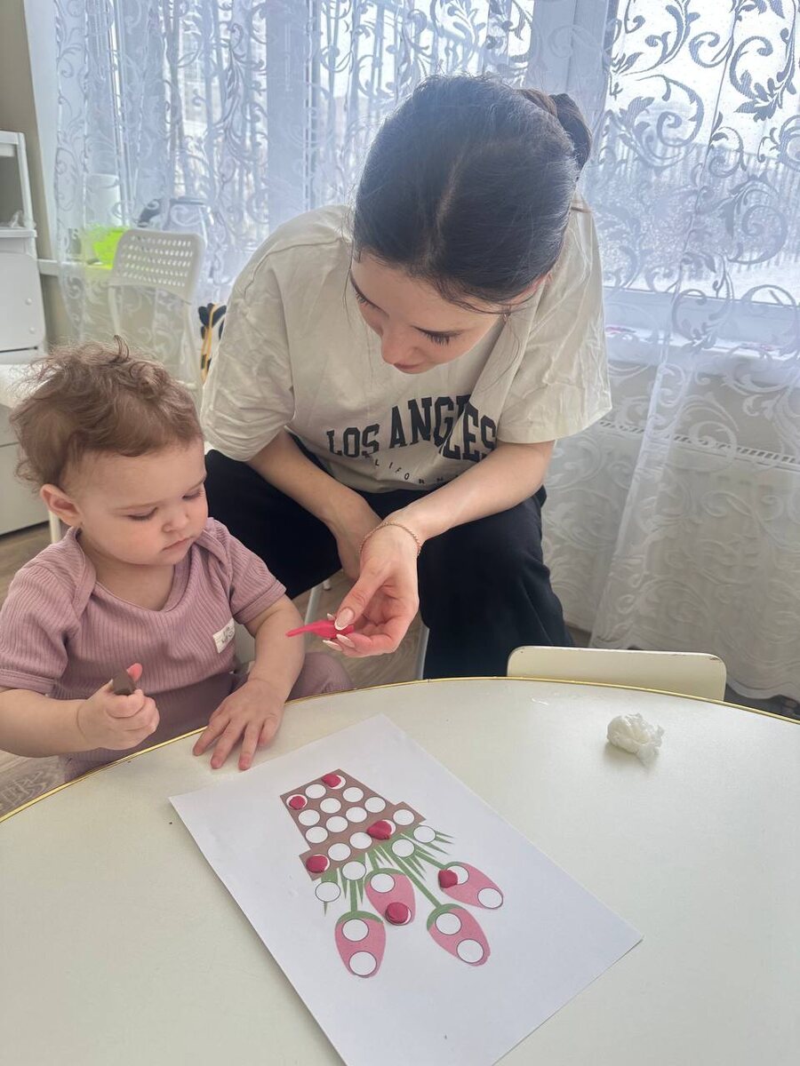 Лепили "Цветочки для мамы", отрабытывали щипковый захват, который способствует формированию творческого мышления, влияет на развитие речевых навыков;