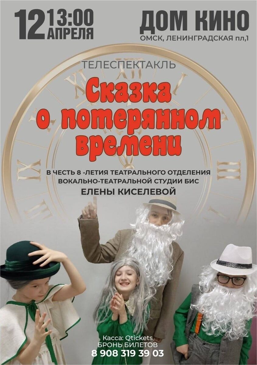 Телеспектакль по сказке Евгения Шварца о школьниках-лентяях, которые превратились в стариков и получили шанс всё исправить. Постановка с юными актёрами студии «БИС» и солистами мастерской эстрадного вокала «Фейерверк». Начало: 12 апреля 2026 13:00 Стоимость: От 180.0 руб. до 300.0 руб. Адрес: г Омск, Ленинградская площадь, 1 Организатор: https://vk.com/public165272129 Друзья! У нас особенное событие! 🎭 12 апреля в 13:00 в Доме кино (Ленинградская пл., 1) — показ телеспектакля «Сказка о потерянном времени», посвящённый 8-летию театрального отделения студии «БИС»! Внимание, родители и педагоги! В некоторых школах как раз начинаются весенние каникулы. А это значит, что самое время спланировать яркий и полезный досуг для детей! Почему стоит... #развлечения_театральная_постановка Узнать подробности, адрес или записаться на событие.