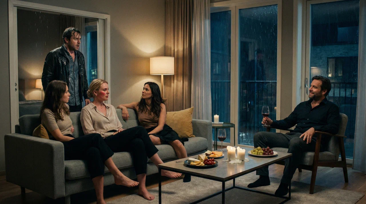 На столе — три пустые бутылки вина, тарелки с сыром и фруктами, оплывшие свечи. Ольга сидит на диване между Светой и Ириной, босиком, поджав ноги. Щёки раскрасневшиеся, глаза блестят.