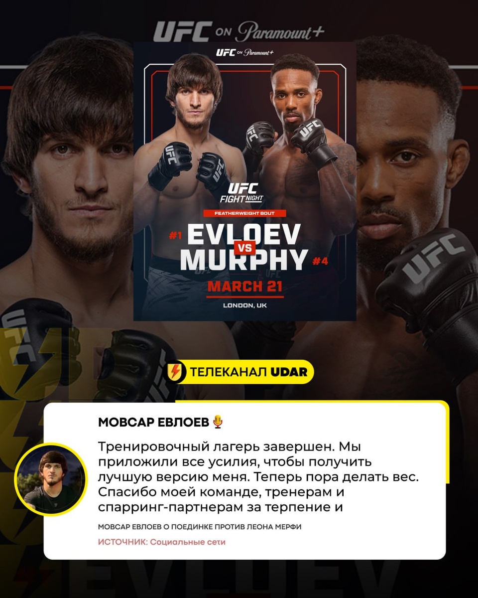 21 марта россиянин Мовсар Евлоев проведет поединок против четвертого номера полулегкого веса Лерона Мерфи. ❤️ - Болеем за Мовсара. 👍Поддержи наш канал cвоим голосом 📺Смотрим бои в прямом эфире ⚡ @teleudar #Единоборства #Спорт #ММА