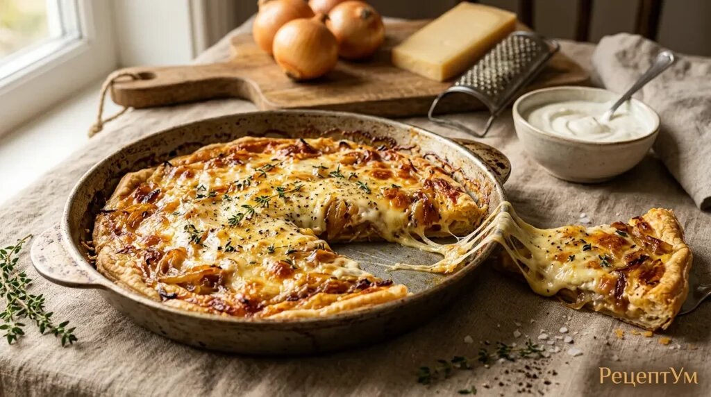 Карамелизация — без спешки: это единственный шаг, который нельзя ускорить. Слабый огонь и 25–30 минут — условие, при котором лук теряет горечь и набирает сладость. Сильный огонь даст жареный лук с горьким привкусом.Масло в тесте — только холодное: тёплое масло даст плотное тесто, а не рассыпчатое. Если кухня жаркая — нарежьте масло кубиками и заморозьте на 5 минут перед замесом.Выбор сыра: грюйер — классика, он тягучий и ореховый. Если не найдёте — берите любой хорошо плавящийся выдержанный сыр: голландский, костромской, пармезан. Смесь двух сортов даёт интересный вкус.Заготовка: тесто можно приготовить за сутки и держать в холодильнике. Лук тоже карамелизуется накануне — в холодильнике он хранится 3 дня. В день подачи останется только собрать и испечь.