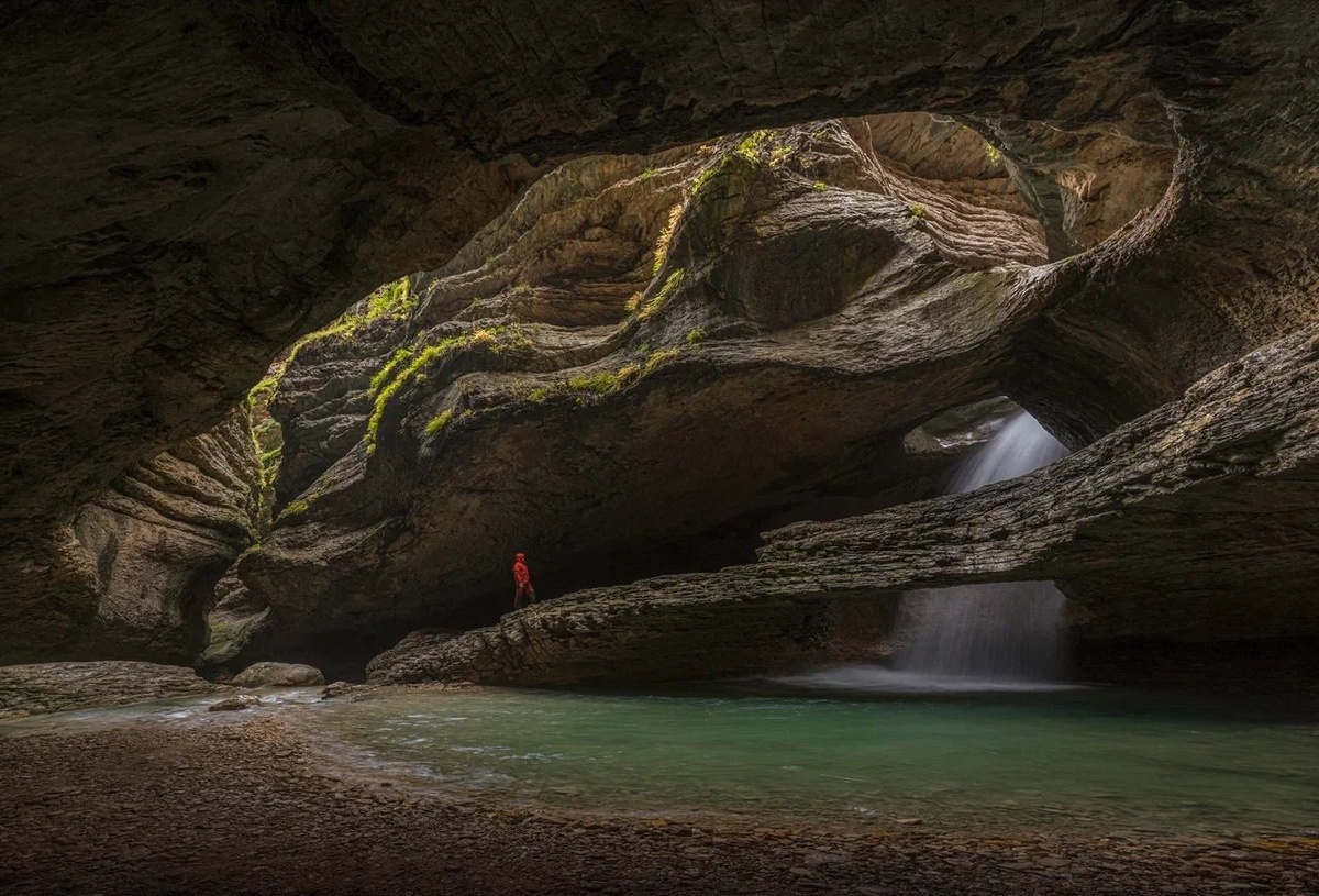 Снимок Влада Соколовского с конкурса РГО «Самая красивая страна». Фото из Дагестана. Справа можно увидеть Салтинский водопад — единственный в республике, находящийся под землей. Точнее на дне Кудалинского каньона в районе села Салта. Туда надо идти пешком, но для гостей оборудована площадка с кафе, чайной и всеми удобствами.