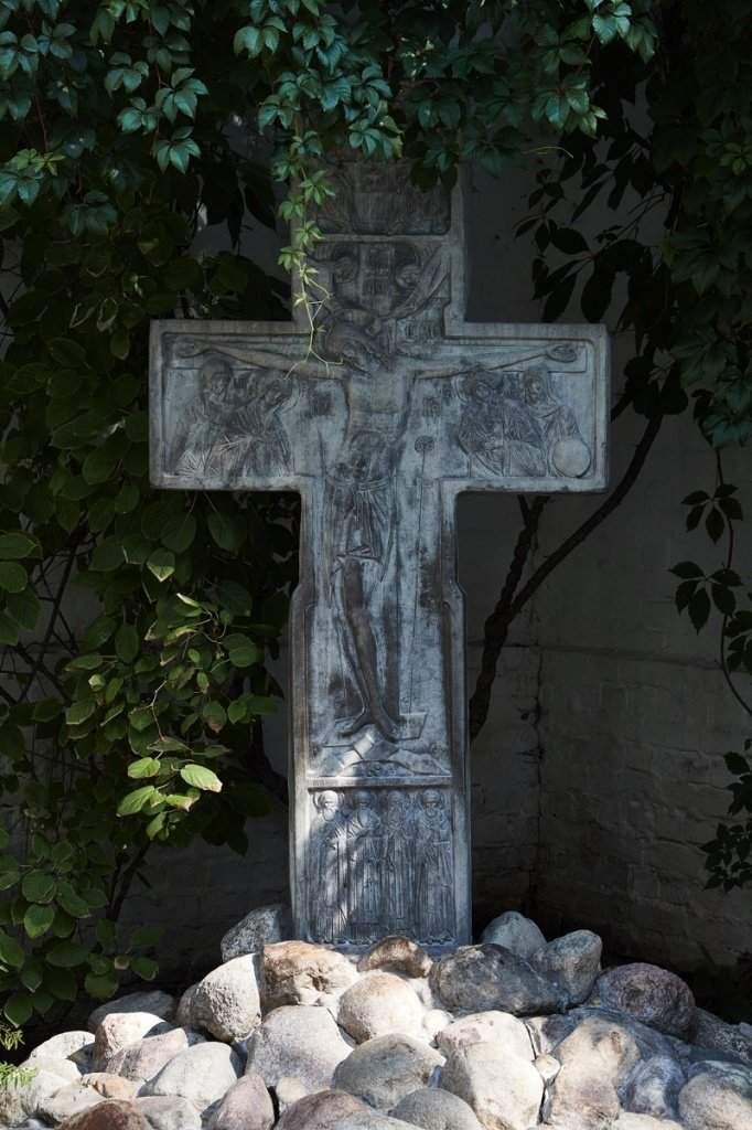 Сразу же при входе в Сретенский монастырь, в уютном уголке справа, стоит очень красивое поклонное Распятие. Редко кто пройдет мимо, не осенив себя крестом и не поклонившись, но, наверное, далеко не все знают, что творцом его является не кто иной, как известнейший в православной среде скульптор Вячеслав Клыков, которому (по словам одного современного писателя) удалось воплотить в камне целую идеологему России.