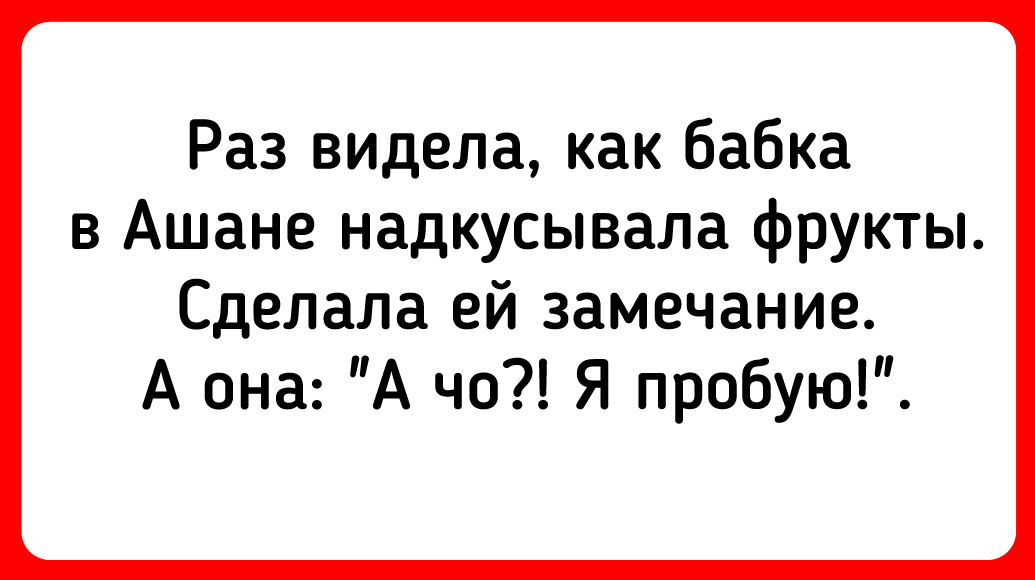 👉 Все эти истории из жизни рассказали читатели наших каналов на Дзене. Еду по правой полосе, не спеша. Передо мной другая машина, и она начала притормаживать. Я, соответственно, тоже. Пытаюсь понять её манёвр. Машина совсем останавливается. Думаю перестроиться в левую полосу и поехать дальше. Пока смотрела в зеркала, машина впереди вдруг начала разворачиваться налево, на встречную полосу. Из правого ряда! И без включения поворотника! Я обалдела. Подумала: хорошо, что я не стала перестраиваться, иначе мы бы столкнулись с этой бестолочью. Гляжу — за рулём девица с накачанными губами. © Екатерина Екатерина / Dzen Раз видела, как бабка в Ашане надкусывала фрукты. Сделала ей замечание. А она: "А чо?! Я пробую!". © Nord Jew / Dzen Живу в деревне. Мои друзья-соседи живут рядом, но… патологически ленивы. Я им тысячу раз предлагал помочь (разумеется, безвозмездно) протянуть в дом воду из колодца и сделать слив из умывальника на улицу, но… Я к ним заходил пить чай, всё было нормально — и вот ро