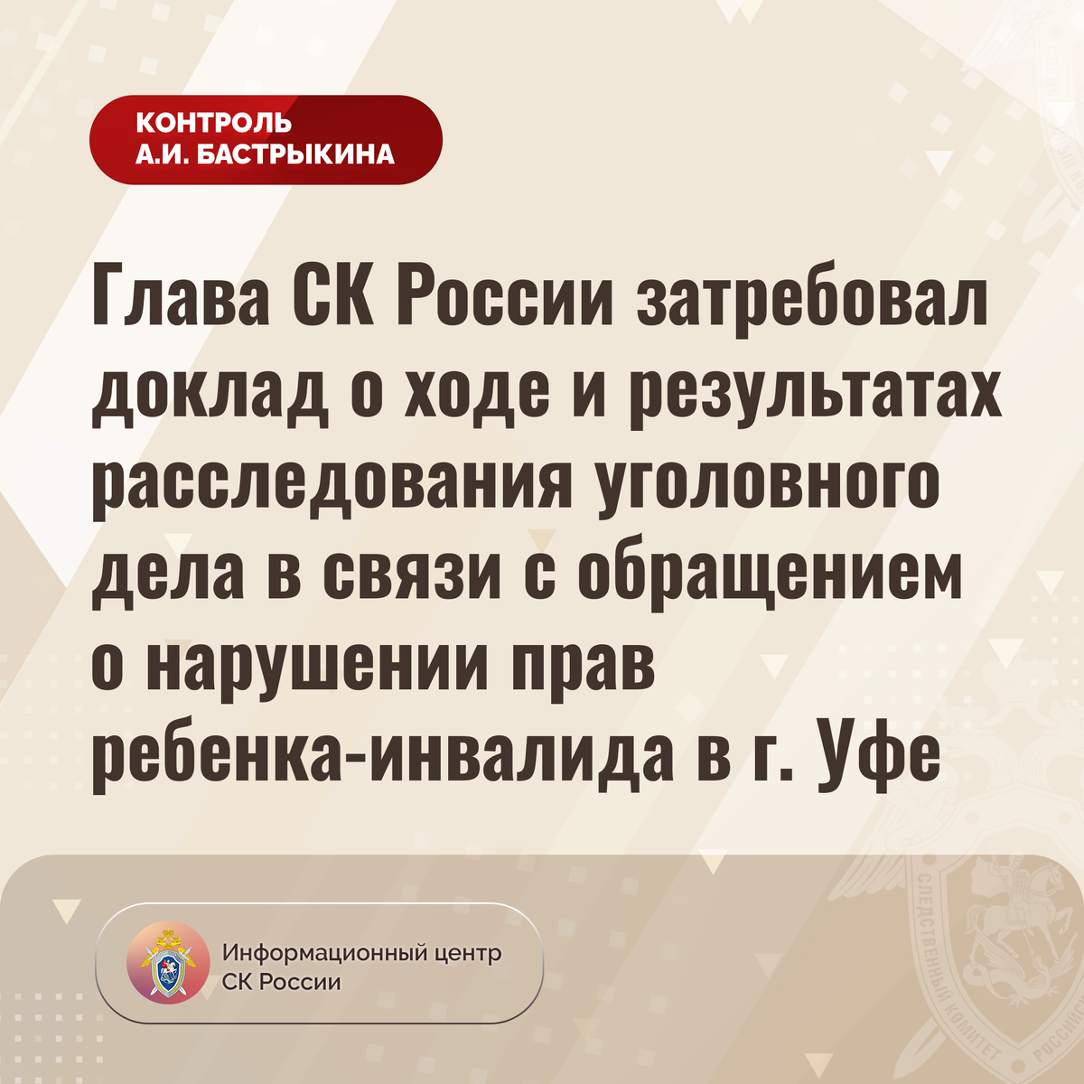 Глава СК России затребовал доклад о ходе и результатах расследования уголовного дела в связи с обращением о нарушении прав ребенка-инвалида
