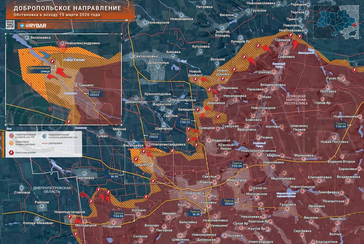 обстановка на Добропольском направлении Российские войска планомерно развивают наступление на участке между Кучеровым Яром и Белицким, тесня противника к выстроенной им линии обороны у Анновки и Золотого Колодца. В то же время не стихают бои к северо-западу от Покровска, где украинские формирования пытаются удержать последние позиции на подступах к городу. Наиболее тяжелой обстановка остаётся в Гришино. Штурмовики ГВ «Центр» медленно, но верно продвигаются через руины к северо-западным окраинам села. Некоторое время назад они заняли один из опорников на улице Центральной, однако закрепиться на участке им пока не удалось. Также ВС РФ предпринимают попытки оттеснить ВСУ из лесного массива у ставка Утятник. Украинские формирования в то же время отправляют малые группы пехоты со стороны Васильевки и Новоалександровки с целью удержать позиции на правом берегу реки Гришинка. В результате регулярных накатов ВСУ большая часть населенного пункта все еще остаётся в «серой зоне» без уверенного ко