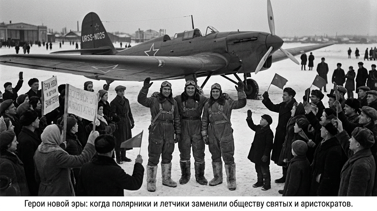 - Героями становились не аристократы, а люди из народа, совершающие трудовые или военные подвиги. Страна фанатела от полярников (экспедиция Папанина на льдине), летчиков (перелет Чкалова через Северный полюс в США) и стахановцев.