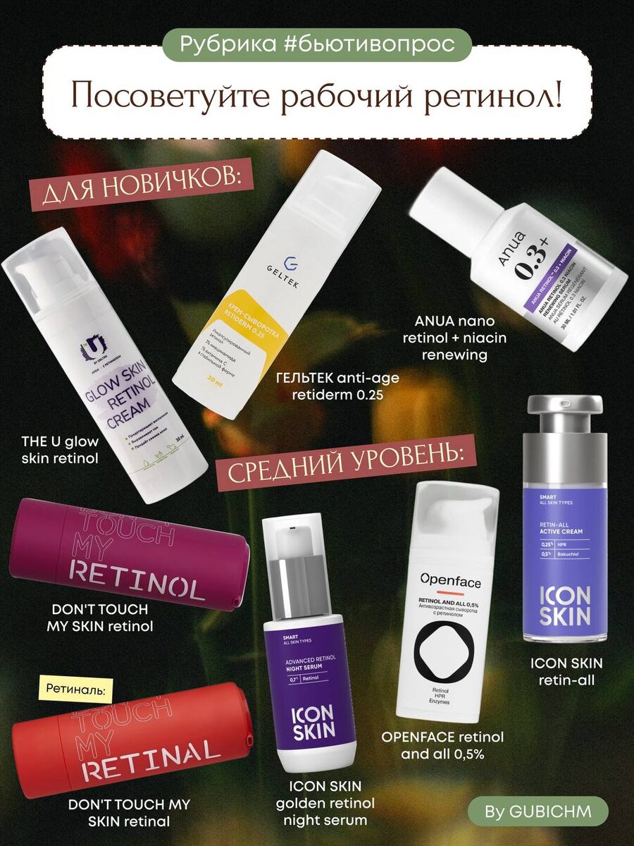 Обращаем внимание, чтобы в составе были: ретинол, ретиналь, HPR (это более мягкая форма), ретинил ретиноат.
