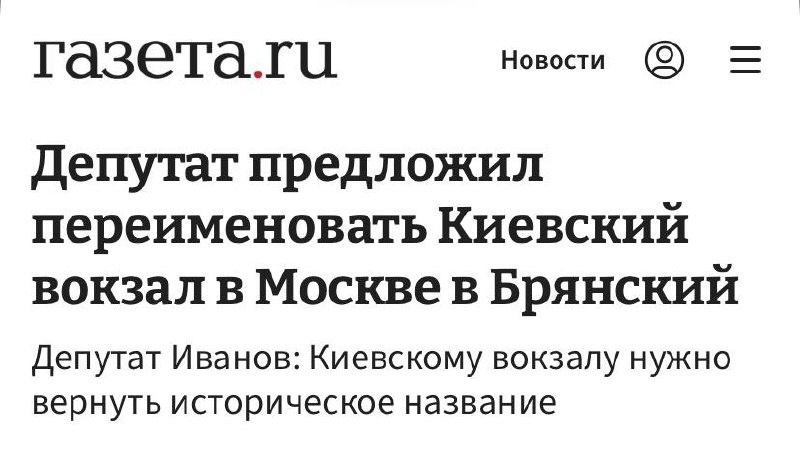 Он заявил, что здание вокзала в Москве — памятник архитектуры, который должен носить «исконное русское имя». До 1934 года вокзал назывался Брянским. К тому же сейчас поезда до Киева не ходят. Поэтому прежнее название будет точнее отражать географию перевозок. 🔺Киев - мать городов русских! Или я что-то путаю? В Брянске видимо уже все хорошо, если местные депутаты рвутся в Москву вокзалы переименовывать. Совсем как депутаты Верховной Рады, которые на прошлой неделе проголосовали за переименование районов в Донецке.