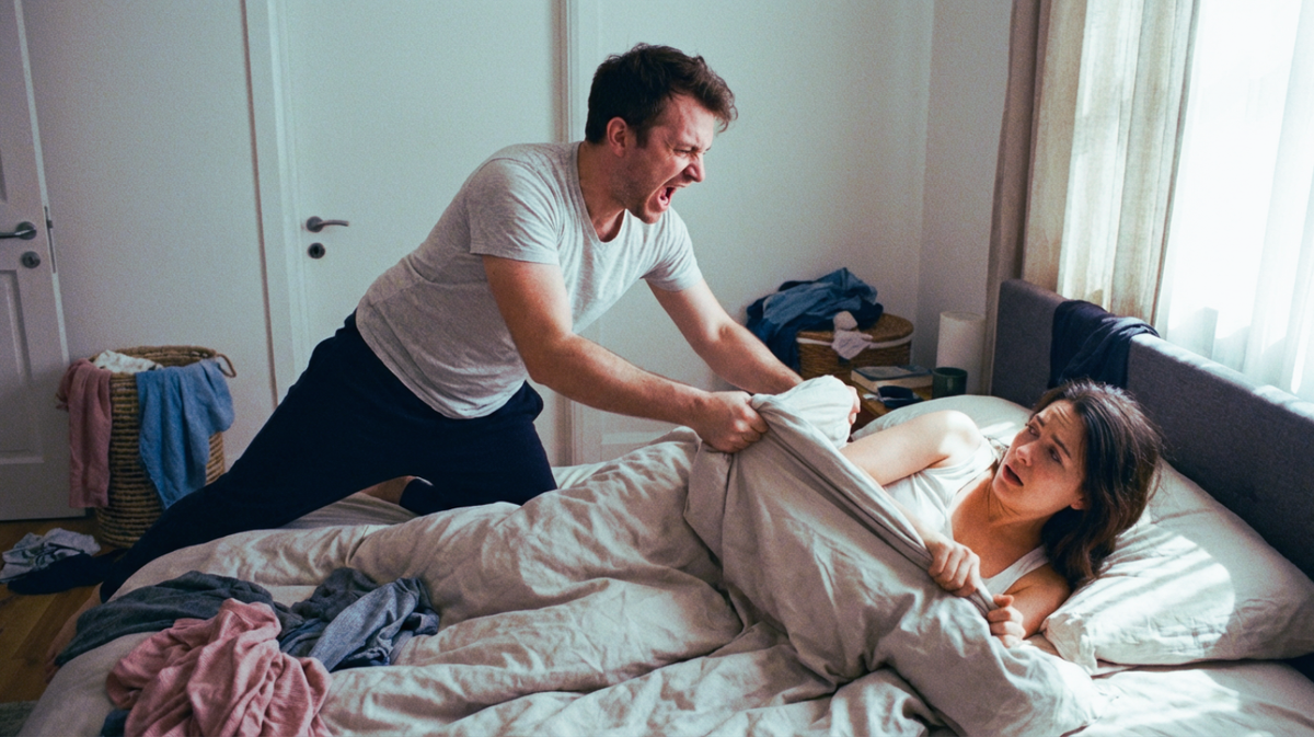 Он схватил край одеяла и резко, одним рывком, сдернул его на пол. Марина осталась лежать в одной шелковой пижаме, свернувшись калачиком, беззащитная и нелепая в своем гневе. Её лицо, отекшее от долгого сна, выражало лишь искреннее возмущение прерванным отдыхом.