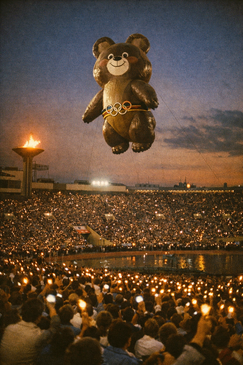 Итак, 3 августа 1980 года, 21:00. Звучит песня «До свиданья, Москва». Мишка поднимается над стадионом, машет лапой и уплывает в ночное небо.