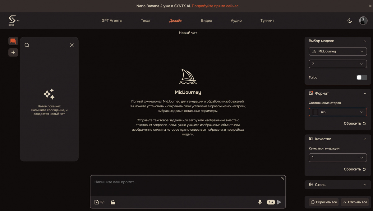 В этой статье я разбираю две модели для генерации изображений, которые использую чаще всего, — и делюсь конкретными промтами, которые дают мне стабильно сильный результат. Все примеры из этой статьи я генерировал в Syntx AI — платформе, где Midjourney, Nano Banana 2 и другие модели доступны в одном интерфейсе, без Discord и без зарубежных карт. Получите 15 бесплатных токенов для генерации ссылке. Midjourney в Syntx AI: сразу к делу Для большинства пользователей в России и СНГ Midjourney остаётся труднодоступным: нужен Discord, нужна зарубежная карта для оплаты, нужно разобраться с ботом в чате. Syntx AI убирает все эти барьеры — вы работаете с Midjourney напрямую через привычный интерфейс. Что умеет Midjourney в 2026 году: фотореалистичные портреты с детализацией кожи и освещения, архитектурная визуализация, двойная экспозиция и сложные многослойные композиции, кинематографические кадры с режиссёрским светом, motion blur, концепт-арт, иллюстрации и логотипы. Лучшие промты для Midjourne