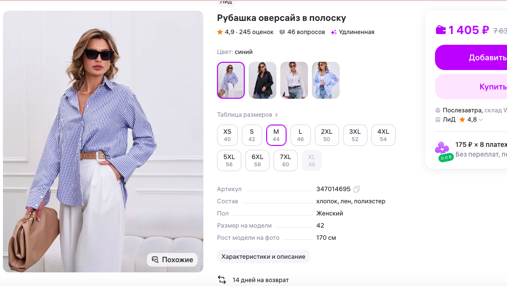 2. Про размеры. На WB всегда смотрите на замеры в сантиметрах, а не на S/M/L. Особенно для брюк палаццо — важна длина шага.