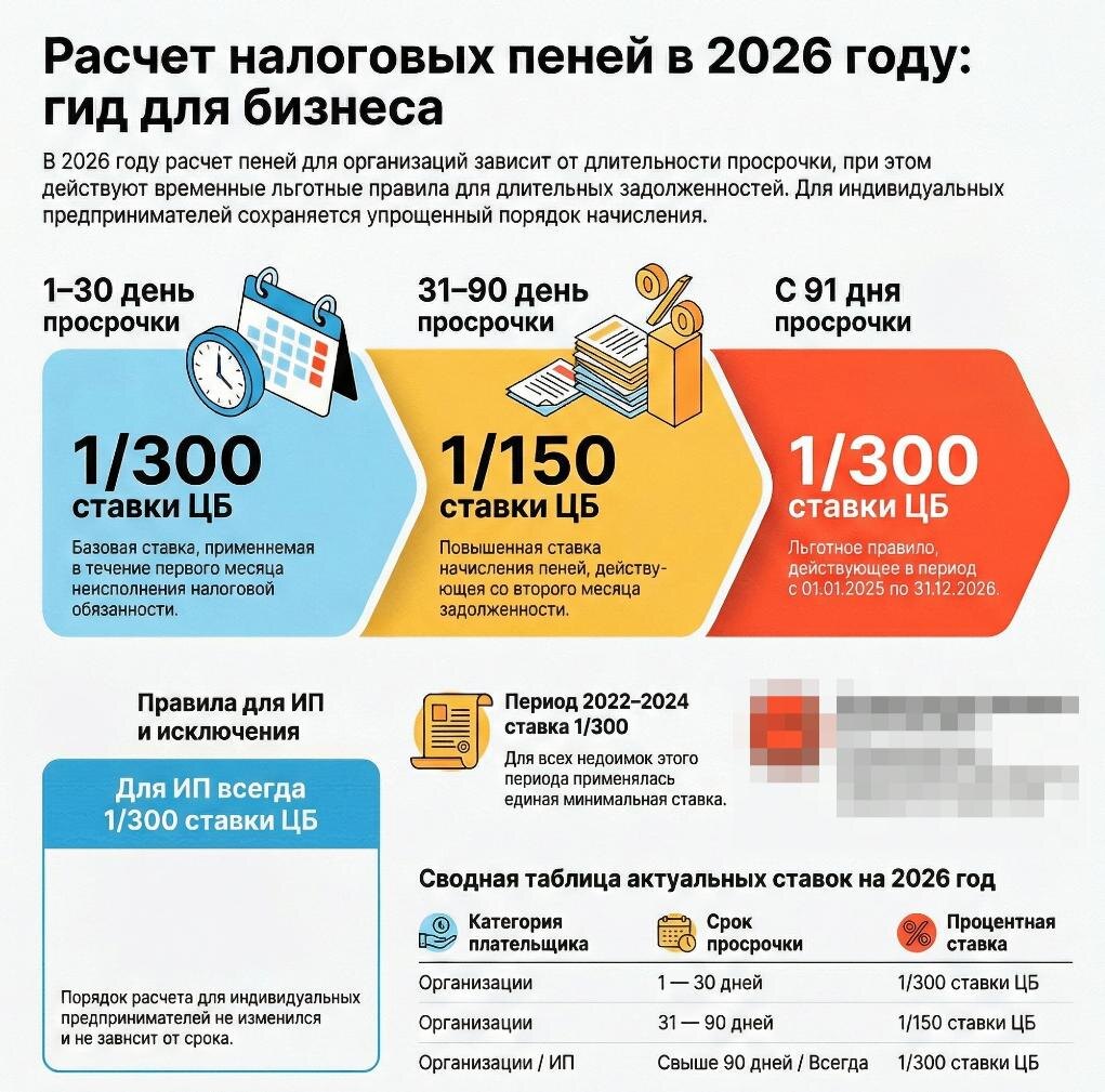 Налоговики подтвердили правила 2025 года для юрлиц… Какие процентные ставки начисления пени применяются для организаций? (официальный сайт ФНС России, раздел "Часто задаваемые вопросы", 15 января 2026 г.) В соответствии с налоговым законодательством для организаций применяются следующие процентные ставки для начисления пени: - со срока уплаты в течение 30 календарных дней пени начисляются по ставке в размере 1/300 ключевой ставки ЦБ РФ; - с 31 дня просрочки исполнения обязанности по уплате налогов пени начисляются по ставке в размере 1/150 ключевой ставки ЦБ РФ. Исключения: - для недоимок образовавшихся до 01.10.2017 применяется ставка 1/300 ключевой ставки ЦБ РФ (п. 9 ст. 13 Федерального закона от 30.11.2016 N 401-ФЗ); - в период с 09.03.2022 по 31.12.2024 пени начисляются по ставке в размере 1/300 ключевой ставки ЦБ РФ (п. 5 ст. 75 НК РФ); - в период с 01.01.2025 по 31.12.2026 с 91 дня просрочки исполнения обязанности по уплате налогов пени начисляются по ставке в размере 1/300 ключе