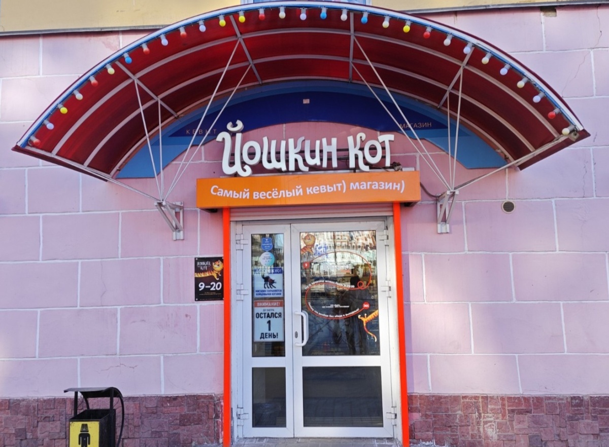 И так, магазин называется "Йошкин кот"! Вот так выглядит вход снаружи. Как только откроете входную дверь, вас сразу встретят двое вот таких кото-друзей, видимо слегка навеселе!😁 Обратите внимание на заголовок прилавка, уже от сюда понимаешь, что это не простой магазин!