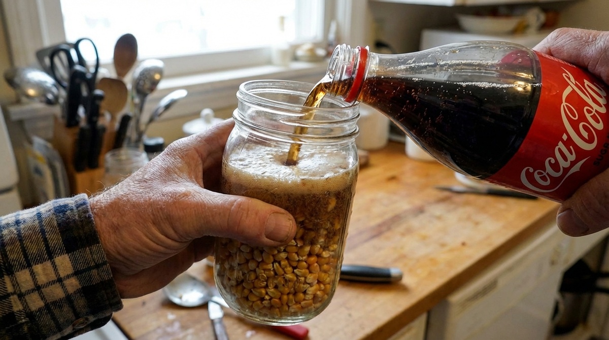Взял стеклянную банку, засыпал две горсти сухой кукурузы и залил классической Кока-колой до краев. Важно: кола должна быть именно с сахаром, версии с сахарозаменителями здесь не сработают. Я плотно закрыл банку и оставил ее на балконе под летним солнцем на двое суток.
