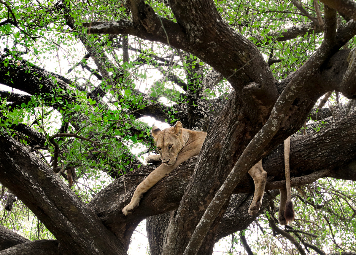 Вот львица отдыхает на ветке.