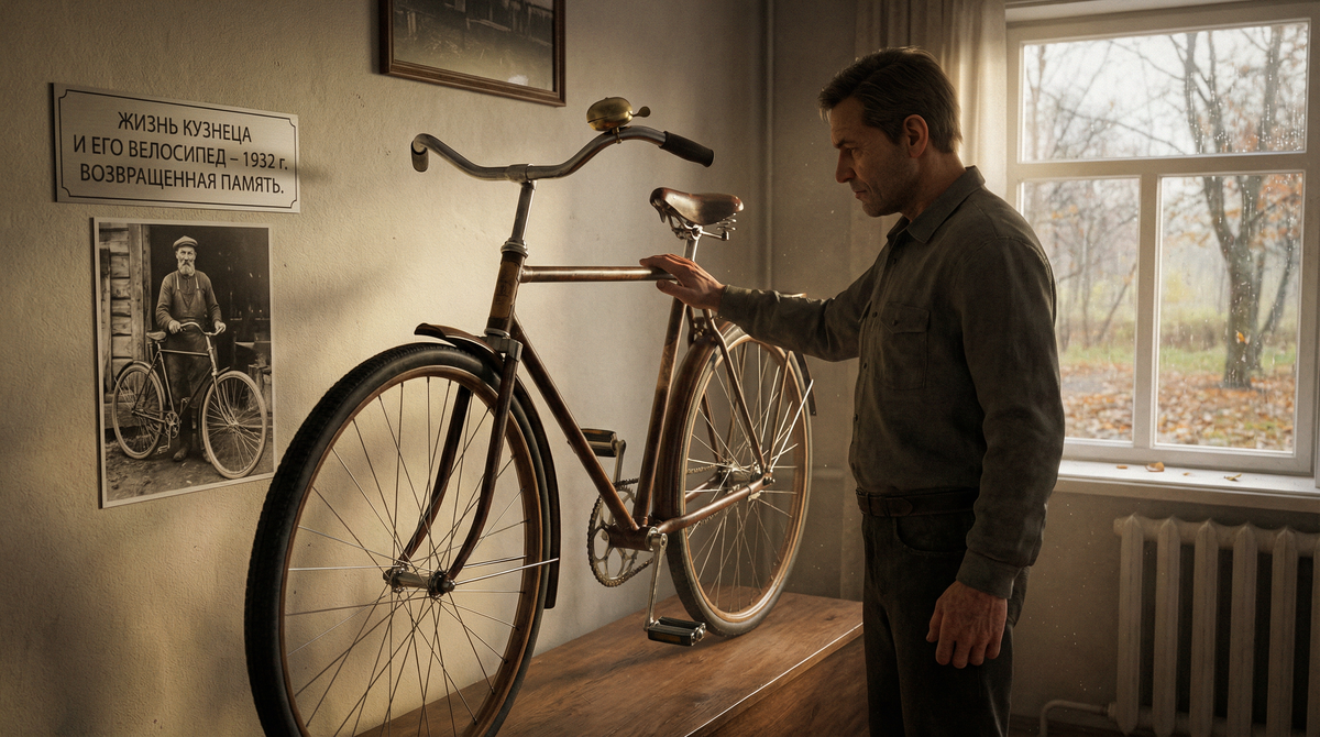 Он стоял на невысоком подиуме у дальней стены. Отреставрированный. Рама – та же, только заново покрашена. Руль выгнутый, как его делал дед. Колёса с новыми спицами, но старыми ободами. И на руле – латунный звонок с вмятиной на боку.