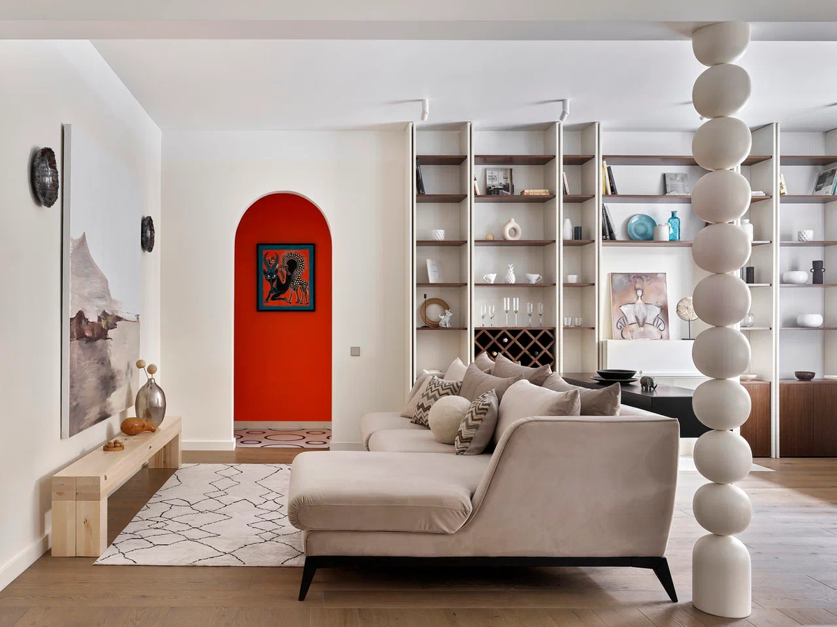 Цвет в современном дизайне интерьера всё чаще становится главным инструментом архитектуры пространства. Один из ярких примеров — проект студии PRO Interior Design (PROID.studio), созданный дизайнером Ириной Фролочкиной и архитектором Артёмом Ерыковым. Главной идеей интерьера стал насыщенный оттенок «Радостный оранжевый» из Архитектурной палитры Aeterna, который задаёт настроение всему пространству и превращает цвет в полноценный архитектурный элемент. В этом проекте цвет выступает не просто декоративным приёмом. Он работает как инструмент композиции и помогает структурировать пространство. Ключевую роль играет оттенок из палитры Aeterna «Радостный оранжевый», который становится главным акцентом интерьера. Насыщенный тон создаёт ощущение энергии, тепла и визуального движения, делая пространство живым и выразительным. Центральный элемент проекта — арка, соединяющая зал с приватной частью квартиры. Именно она стала главным композиционным центром интерьера. Стена коридора окрашена в отте