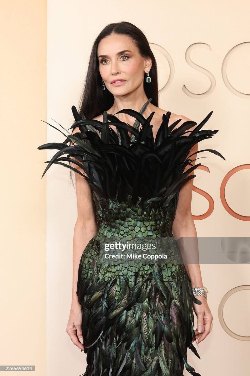Деми Мур, в отличие от нас, не устала от обилия перьев на показах во время модного месяца. Поэтому ее макси украшено этим декором.