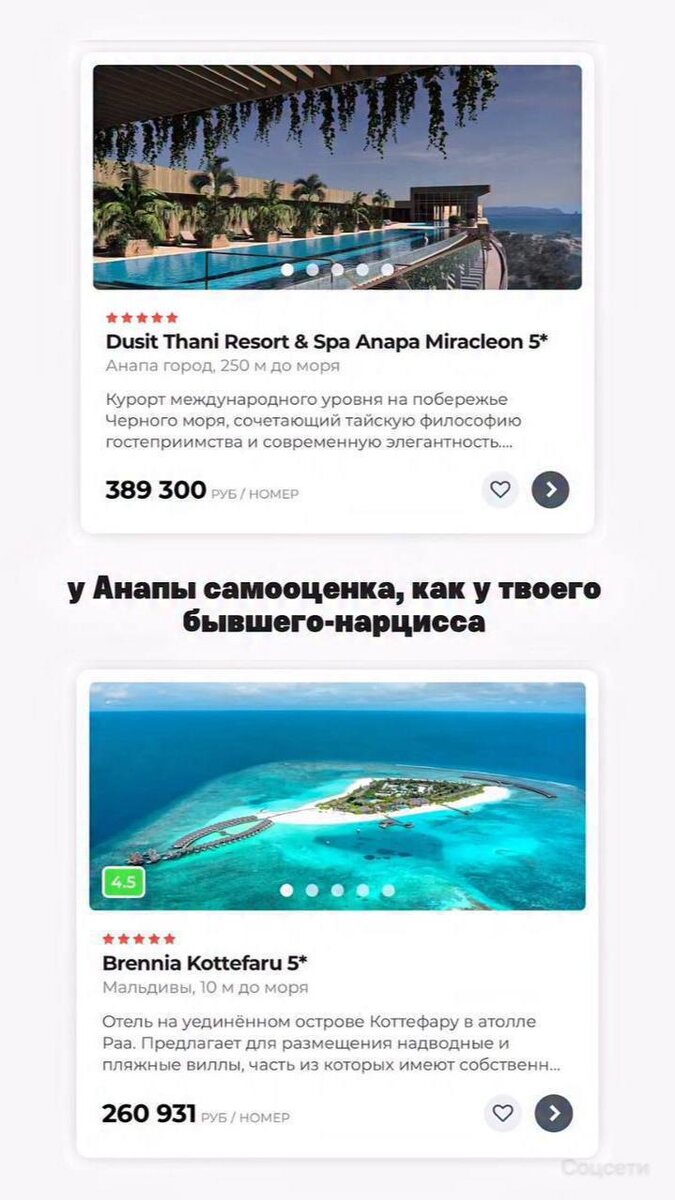 Семь ночей в одном из люксовых отелей кубанского курорта теперь обходятся туристам почти в 400 тысяч рублей. Для сравнения, аналогичный тур на Мальдивы — на остров Коттефару с проживанием в виллах над водой — стоит около 270 тысяч рублей. А что выберете вы? ❤️ — Анапа 👀 — Мальдивы 📲 Читайте нас в MAX 😊 Подписаться | Прислать новость