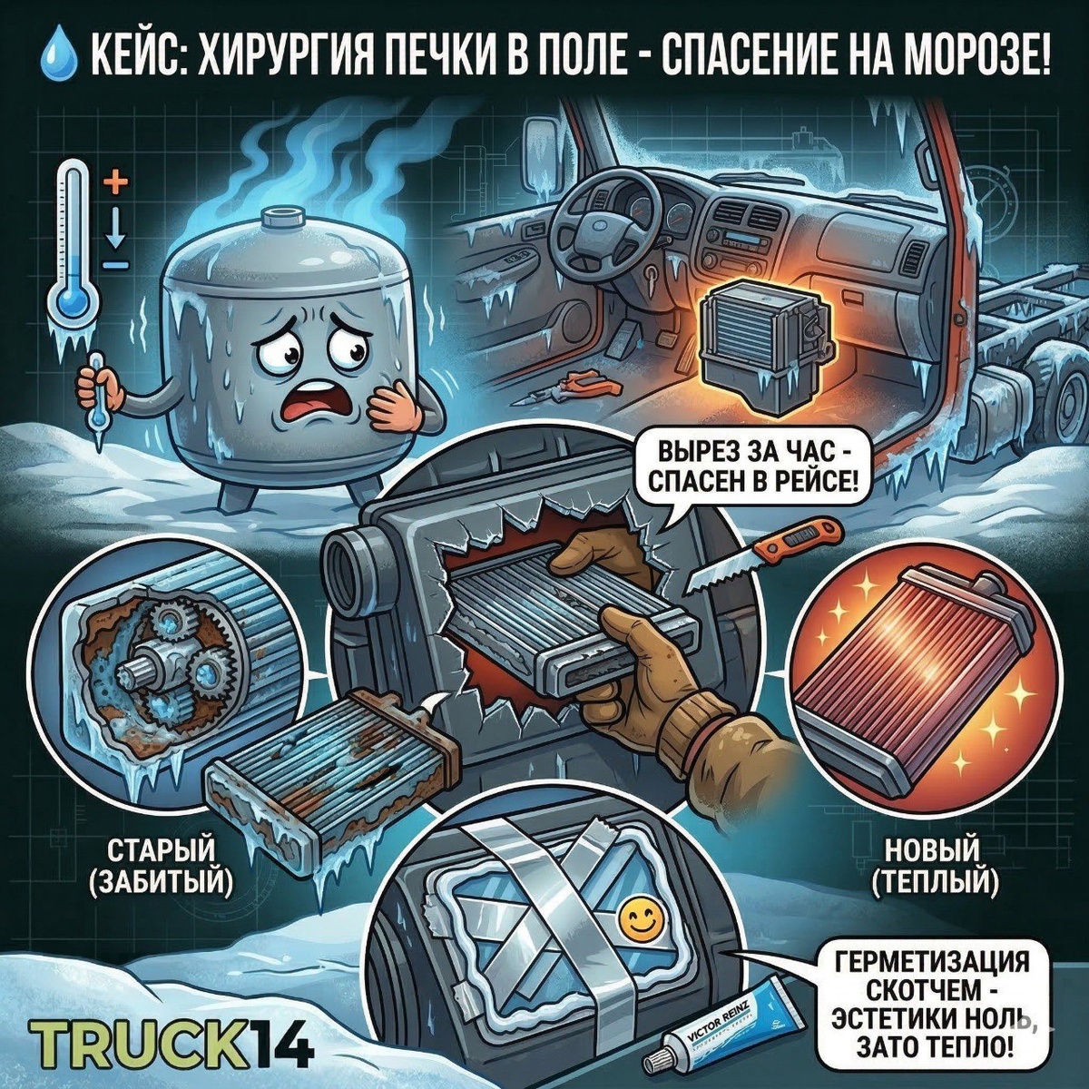 Март в Якутии коварен: днем солнце, а ночью на трассе стабильно давит за -30°C. Если в рейсе потек или наглухо забился радиатор отопителя, кабина за час превращается в криокамеру. По правилам нужно снимать всю торпедо. Но на морозе пластик хрупкий, как стекло — попытаетесь разобрать панель, и она разлетится в щепки. Как опытные северяне меняют печку, не разбирая полкабины? 👇 🪚 1. «Хирургический» надрез Вместо демонтажа панели вырезается технологическое окно прямо в пластиковом коробе климатической установки (обычно со стороны ног пассажира). Нагретым ножом или полотном от ножовки аккуратно вскрывается боковина корпуса. 🔄 2. Горячая замена Патрубки под капотом пережимаются струбцинами (чтобы не вылить антифриз в салон). Через вырезанное окно старый забитый радиатор вытаскивается по направляющим, как кассета, а на его место вставляется новый. 🛡 3. Сборка и герметизация Вырезанный кусок пластика ставится на место. Шов густо промазывается морозостойким силиконовым герметиком (Victo