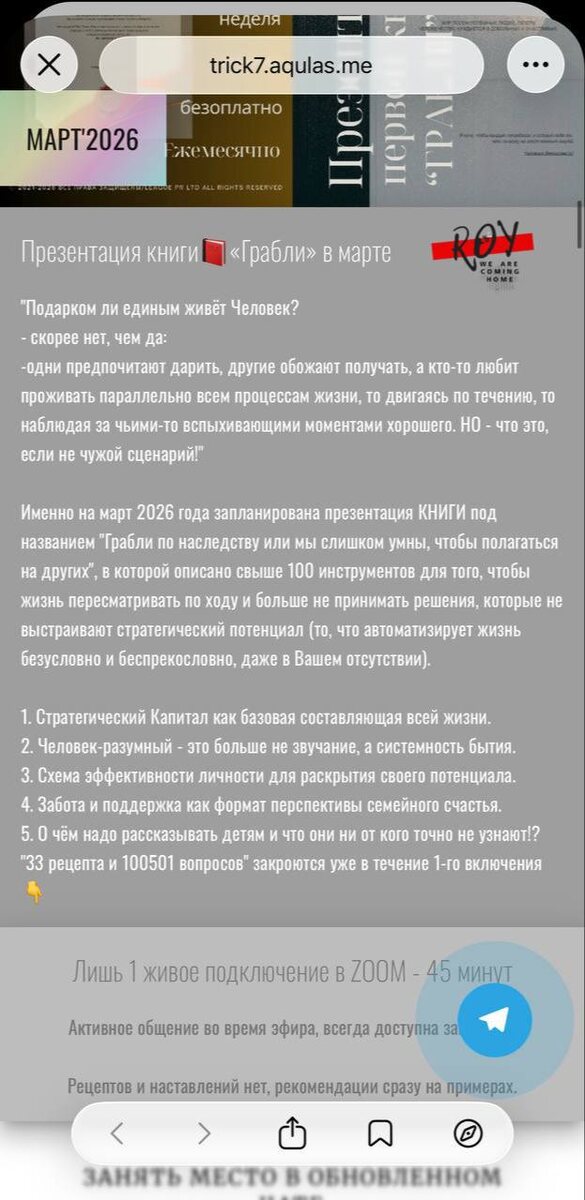 Пятнадцатого марта стартовал важнейший 3D ПРАКТИКУМ №23 в формате фокус-недели: 16.03 в 16:00 мск запланирован ZOOM, а затем в течение 7 активных дней мы в закрытом Telegram-Чате потренируемся в эффективном планировании для самоисцеления. И это не очередной вебинар. Это атмосфера, где мы разберём то, на чем строится вся Ваша жизнь: • спокойствие как систему, а не паузу между штормами • иерархию «родители — дети — родители» без чувства вины и долженствования • самоэффективность, которая не требует надрыва • непрерывность как основу движения • и главное — стратегию систематизации Ваших мыследействий ➕ И, конечно, долгожданная презентация моей первой книги-инструментария 📕 «ГРАБЛИ ПО НАСЛЕДСТВУ ИЛИ МЫ СЛИШКОМ УМНЫ, ЧТОБЫ ПОЛАГАТЬСЯ НА ДРУГИХ» В книге — свыше 100 инструментов, чтобы: 1️⃣ пересматривать жизнь по ходу, 2️⃣ перестать принимать решения, которые не выстраивают стратегический потенциал, 3️⃣ настроить систему, которая работает даже в Ваше отсутствие. ЧТО ЕЩЁ БУДЕТ НА ZOOM-вс