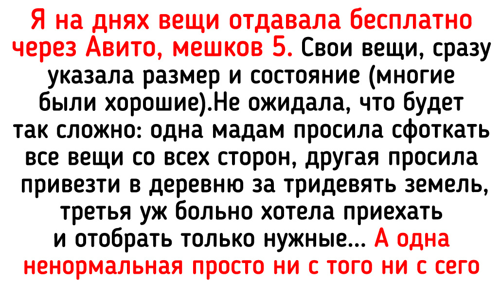Одна попросила взять вещи с собой (чтобы я на работу привезла, а она якобы подъедет и заберёт, просто перекидаем из машины в машину). Она так и не появилась, на звонки не отвечала. Ну я просто взяла вещи и отнесла на мусорку возле работы, поставила пакеты рядом, поехала в магазин. Возвращаюсь той же дорогой, мимолётом на мусорку гляжу — а пакетов уже нет… Буквально минут 20 прошло. © Светлый путь. Рассказы / Dzen