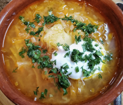 Ингредиенты: - 800 г квашеной капусты - 100 г репчатого лука - 100 г моркови - корень петрушки - 100 г томата-пюре - 1 ст. л. муки - 50 г сливочного масла - 50 г сметаны - перец черный душистый - лавровый лист - зелень петрушки или укропа Приготовление: Квашеную капусту перебрать, промыть, нарезать, положить в глубокую сковороду или сотейник, залить двумя стаканами бульона или воды, добавить масло, прикрыть крышкой и тушить в течение часа, периодически помешивая, затем переложить в кастрюлю, залить бульоном, добавить поджаренные с томатом лук и коренья, довести щи до полной готовности. В конце варки добавить пряности и поджаренную мучную заправку. Перед подачей щи заправить сметаной и мелко рубленной зеленью петрушки или укропа.