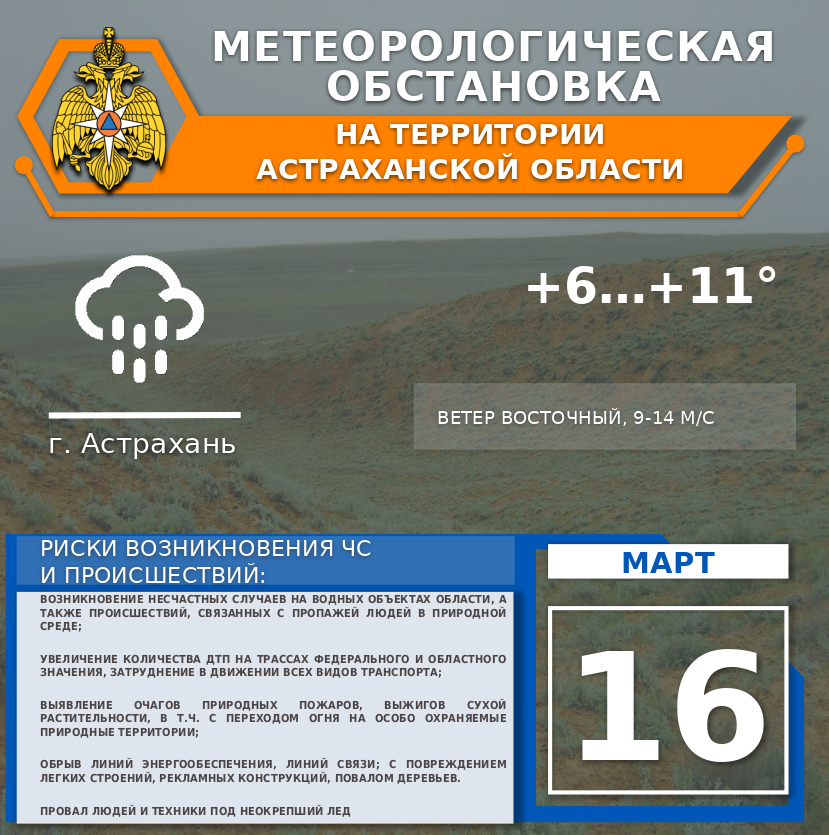 По г. Астрахань облачно. Небольшой дождь. Ветер восточный 9-14 м/с. Температура воздуха +7...+9°.