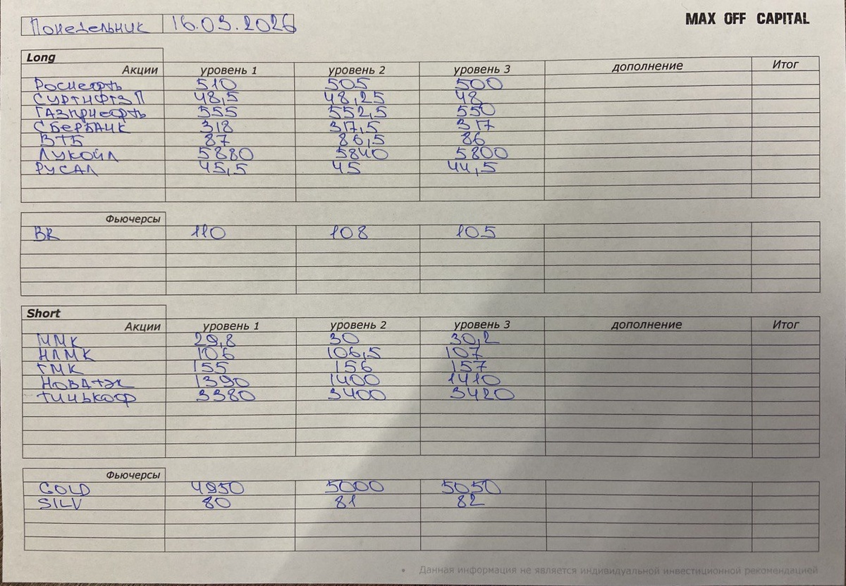 ✅ РЕКОМЕНДАЦИИ НА СЕГОДНЯ ➡️ Личный совет 👍 Сегодняшний день в PRO ▫️ Наши РЕСУРСЫ 😉 Стратегия ЗАДЁРГА 😉 Как пользоваться рекомендациями 😉 Как пользоваться ATR 😉 Видео моих сделок 😉 Куда ставить СТОП 😉 Дневник трейдера 😉 Как определить точку входа Уровни (часть 1) Уровни (часть 2) ТОЧКА ВХОДА Часть1 ТВХ Пробой ТВХ ЛП1Б (ложный пробой 1 баром) ТВХ ЛП2Б (ложный пробой 2 барами) ТВХ СЛП (сложный ложный пробой) ТВХ Отбой 1 баром ТВХ Отбой 2 барами ТВХ Дополнение Как рассчитать ATR Таблица рсчёта ATR Вероятности на рынке (часть1) Вероятности на рынке (часть2) Худшие дни для торговли на Бирже Зачем нужен индекс ММВБ Хватит делать эту ошибку Как работает крупный участник Что такое сильнее рынка Кто за кем ходит Как выбрать направление Где смотреть ИНДЕКСЫ и ТОВАРЫ 💬 Бесплатный | Чат - ПЕРЕЙТИ ❗️Помним, сегодня Понедельник и пятничные закрытия могут быть всего лишь фиксацией прибыли ! #рекомендации
