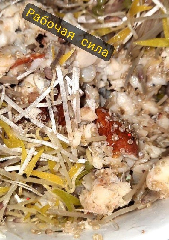" Морской язык в пароварке Вяленные помидоры собственного приготовления Маш пророщенный 5 дней Киноа отваренный Масло растительное с травами из банки вяленных помидор. ➿️➿️➿️➿️➿️➿️➿️➿️➿️➿️ Рыбу разобрать, смешать с вялеными помидорами и промять руками для соединения вкусов, добавить киноа и влить масло, на удобные части порезать ростки маша, все смешать. Примерный расчет каллорий: Морской язык 91, белок 18.8 Киноа 120, белок 4.4 Вяленные помидоры 138, белок 1.7 Пророщенный маш 30, белок 3 В 100 гр салата приблизительно 95 каллорий, 7 гр белка.
