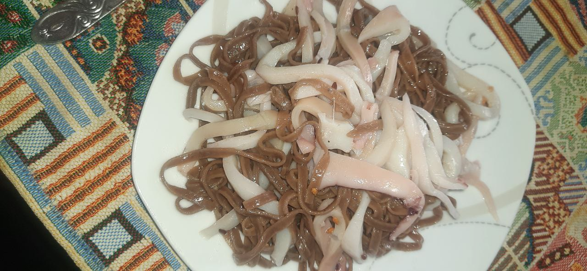 Гречневую лапшу отварить, промыть холодной водой, дать стечь воде.