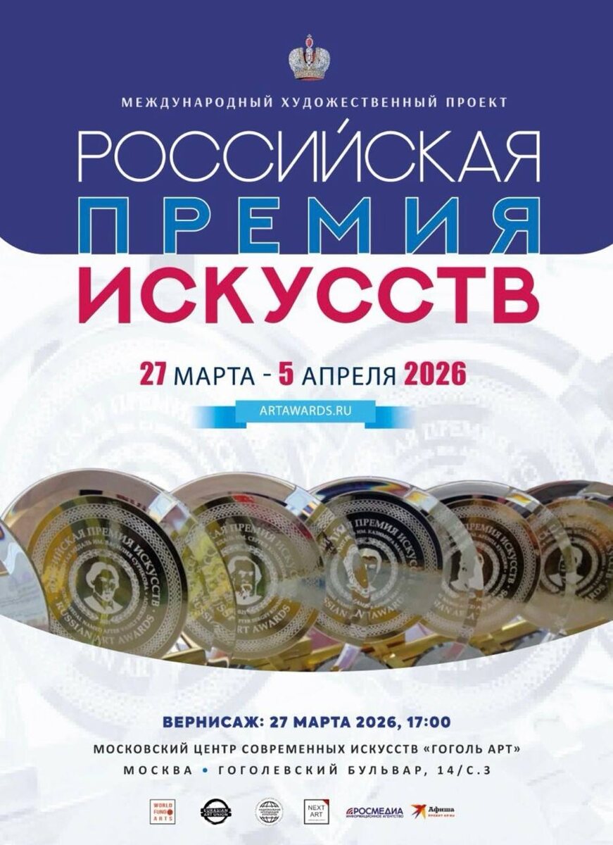 ». Пространство начинает свою историю с грандиозного события — Российской премии искусств. Лучшие авторы страны представят свои произведения: от традиционной живописи и скульптуры до самых смелых визуальных решений. 📍 Место проведения: Центр современных искусств «Гоголь Арт» (Гоголевский бульвар, 14с3, Москва) 🔥 Проект: Российская премия искусств Станьте частью обновленного арт-сообщества столицы! 📅 Даты: Открытие — 27 марта в 17:00 Награждение лауреатов — 3 апреля в 18:00 Закрытие — 5 апреля в 16:00 Подробности: www.Artawards.club Проект реализуется: ЕВРАЗИЙСКИМ ХУДОЖЕСТВЕННЫМ СОЮЗОМ (EurasianArtUnion) Партнеры и организаторы: ИА «РОСМЕДИА», АНО «ИНФОМЕДИА», «НЕВО-СОЮЗ», Art Future Gallery.