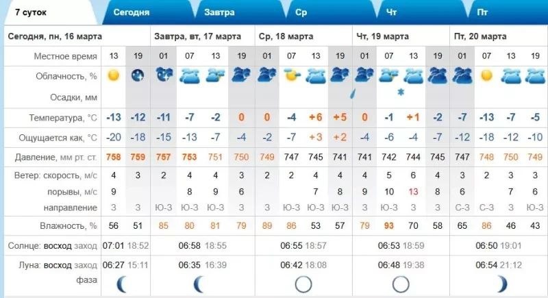 Сегодня, 16 марта, днём -13, небо будет ясным, без осадков, ветер западный 4-9 м/с. Во вторник ночью -11), днём -2, облачно, по-прежнему без осадков, ветер юго-западного направления 4-9 м/с. В среду резко потеплеет: ночная температура воздуха составит 0 градусов, дневная достигнет +6, небо станет пасмурным, ветер юго-западный до 7 м/с. В четверг в тёмное время суток 0 градусов, в светлое воздух прогреется до +1, небольшой снег, ветер западный, его порывы достигнут 13 м/с. В пятницу снова мороз: и ночью, и днём до -7, без осадков, ветер западный не более 7 м/с. 🇷🇺 Запад24 в МАХ ™️Запад24 в ВК 🌐 Наш сайт