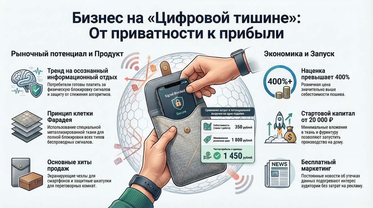 Новостные ленты ежедневно пестрят сообщениями об утечках данных и постоянном анализе поведения пользователей умными алгоритмами. В ответ зародился мощный социальный тренд на осознанный информационный отдых. Люди готовы платить за физическую блокировку сигналов. Производство экранирующих чехлов для смартфонов и шкатулок для переговорных комнат (работающих по принципу клетки Фарадея) — абсолютный хит. Себестоимость пошива одного чехла из специальной металлизированной ткани составляет около 350 рублей, а розничная цена стартует от 1 800 рублей. Наценка превышает 400%. Производство экранирующих изделий для «цифровой тишины» — это понятный и высокомаржинальный бизнес на стыке ручного труда и современных технологических угроз в России. Российский рынок созрел, конкуренция пока минимальна, а тема приватности звучит всё громче, бесплатно подогревая интерес к вашему продукту. Главная задача — строго соблюдать технологию блокировки и выстроить доверие за счет честного видеодоказательства эффекти