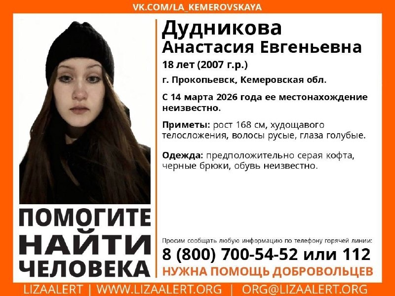 ❗️Волонтеры подключились к поискам пропавшей в Прокопьевске девушки. Дудникова Анастасия Евгеньевна, 18 лет. С 14 марта 2026 года ее местонахождение неизвестно. Инфорг: Екатерина (Шальная) 89131270943. ПОДПИШИСЬ 🔴 ПРЕДЛОЖИ Ⓜ МАХ НАШ