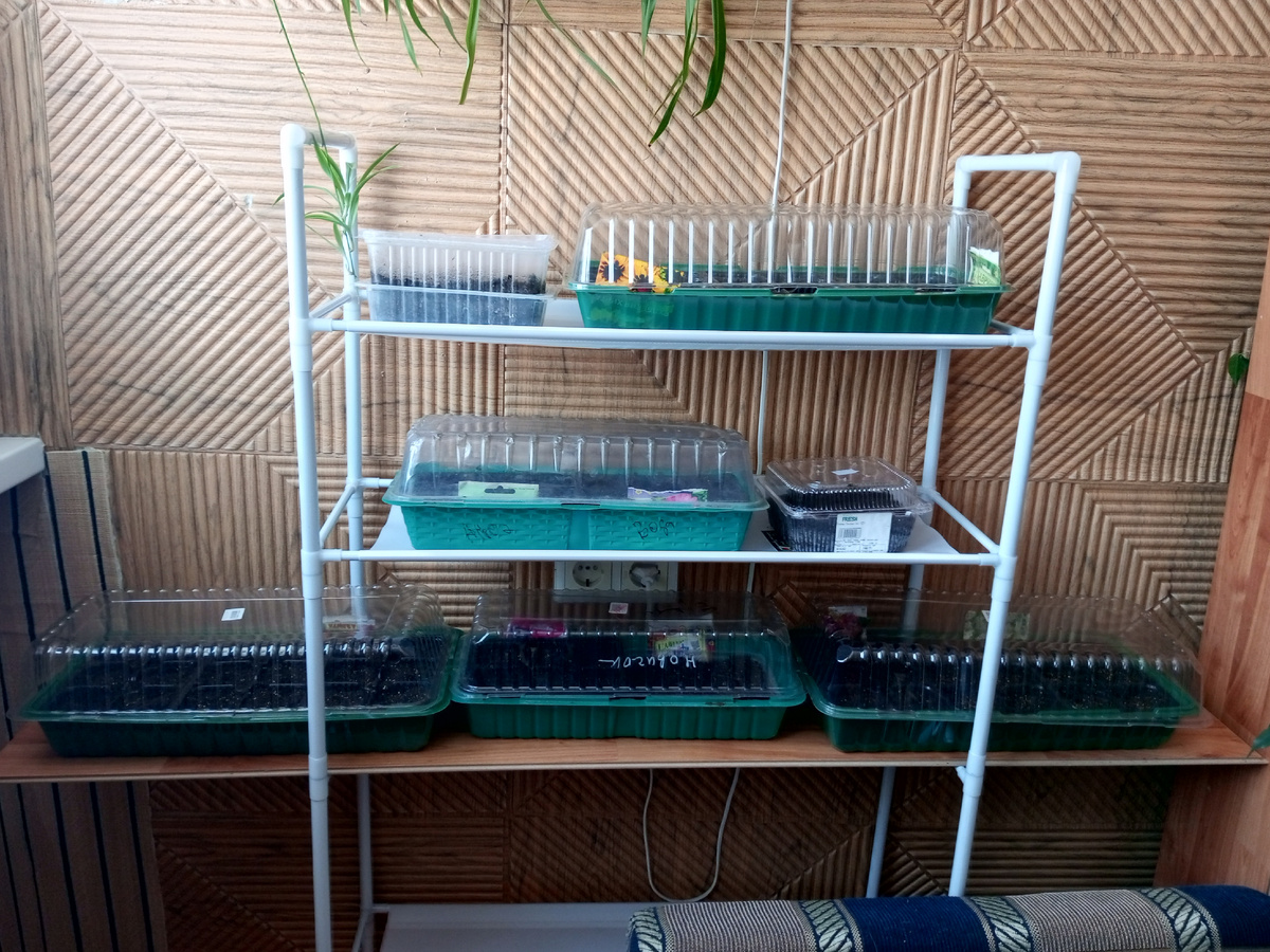 Вот уже и середина марта - 15.03.2026. На улице +5, на солнце +10-12. Солнышко припекает, снег оседает и местами уже появились проталины, а там травка зеленеет... Посевная в самом разгаре. Плошек становится все больше, а места все меньше. Расширила место на стеллаже с помощью доски ламината. Баклажаны и перчики подросли. Баклажаны начали выпускать по следующей паре листиков. Скоро нужно будет их пересаживать в горшочки побольше. А вот перчики. Они очень реагируют на освещенность и нужно каждый день поворачивать плошку то одним краем к окну, то другим, иначе перчики сильно наклоняются в сторону света. Или нужно придумать какую-то светоотражающую перегородку... После посева баклажанов и перцев я их полила 2 раза. Перед поливом обязательно проверяю, чтобы грунт был сухой сверху. Полив осуществляю только через поддон. Воды наливаю до середины "стаканчика". Жду полчаса. Оставшуюся воду обязательно сливаю. Так как перцев оказалось маловато, то я решила что мне просто необходимо посеять ост