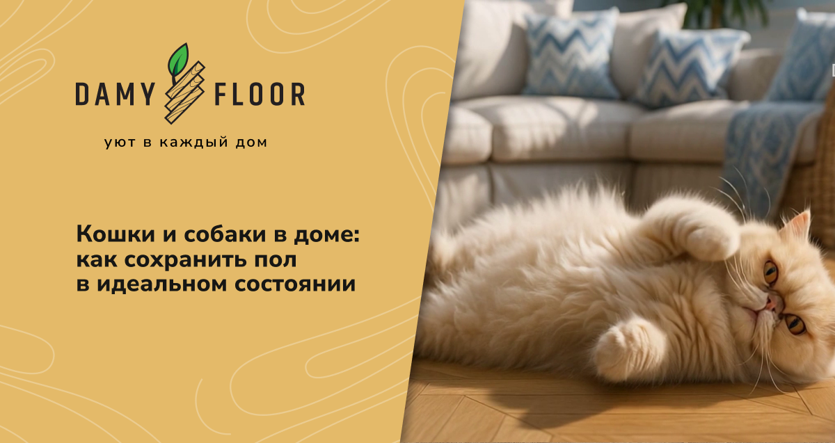 Домашние животные — это дополнительная нагрузка на напольное покрытие в доме. Частые уборки, песок после прогулки, влага, когти — всё это ежедневно влияет на состояние пола. Грамотный уход строится на регулярных действиях и правильном выборе средств. Даем понятную систему ухода за полом, если в доме живут кошки или собаки. При наличии питомцев шерсть и мелкий мусор появляются каждый день. Если не убирать их регулярно, они работают как абразив и постепенно царапают поверхность. Что важно делать ежедневно: Такая поддерживающая уборка снижает нагрузку на покрытие и помогает сохранить его внешний вид надолго. Если в квартире есть питомцы, к покрытию предъявляются повышенные требования: износостойкость, влагостойкость и устойчивость к царапинам. Оптимальный вариант — покрытия с усиленным защитным слоем, которые не боятся влаги. Например, усовершенствованный кварцевый SPC ламинат DAMY FLOOR с защитным слоем 0,55 или 0,75 мм. Он устойчив к влаге, не скользит, сохраняет внешний вид при активн