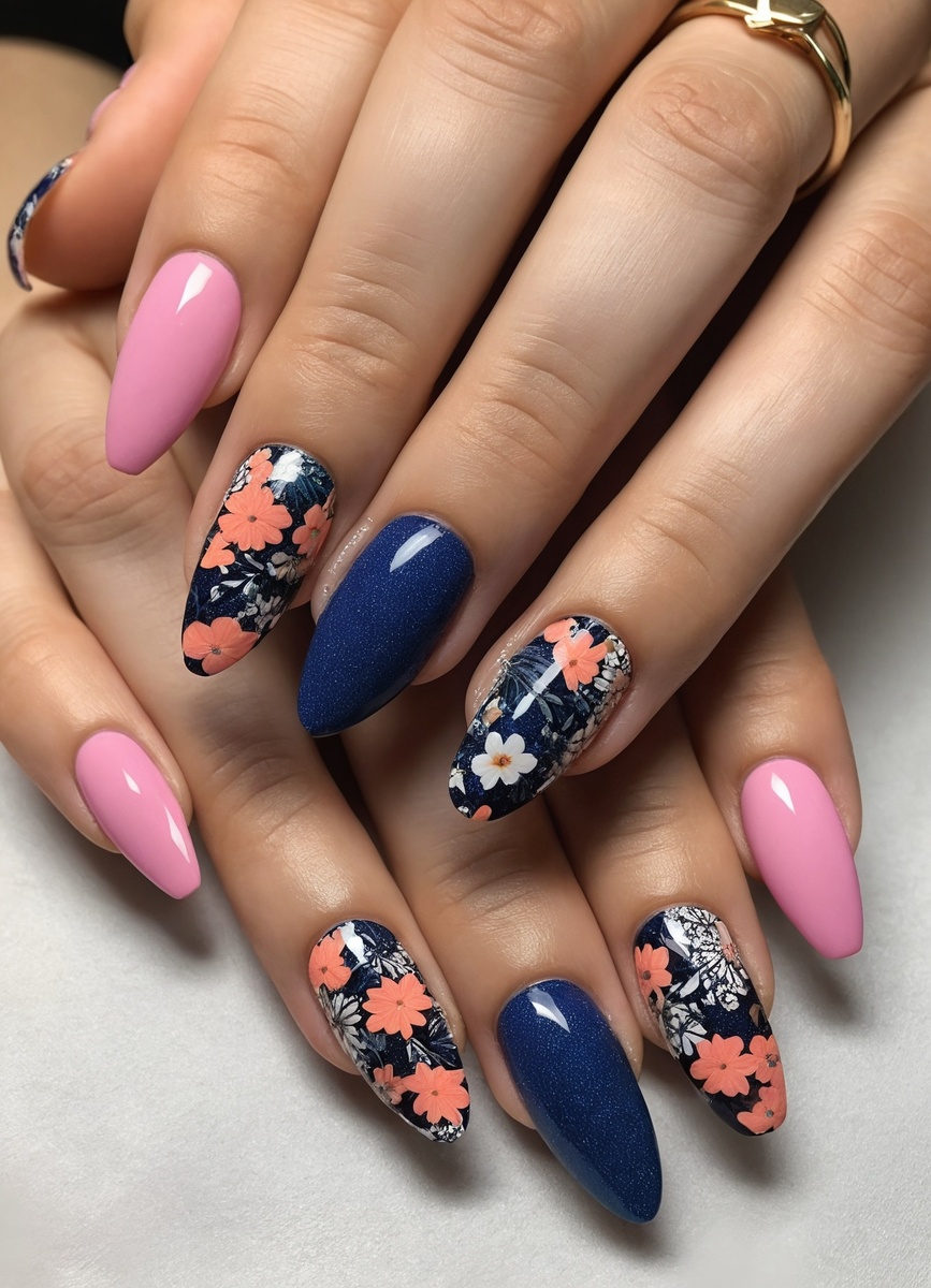 В маникюре "разные руки" актуальны цветовые палитры, которые создают гармонию и контраст. Нежные пастельные оттенки, такие как мятный и розовый, прекрасно сочетаются с яркими акцентами, например, оранжевым или фиолетовым. Использование металлизированных и перламутровых текстур добавляет глубину и объем. Комбинирование матовых и глянцевых покрытий также стало популярным, позволяя создавать интересные визуальные эффекты.