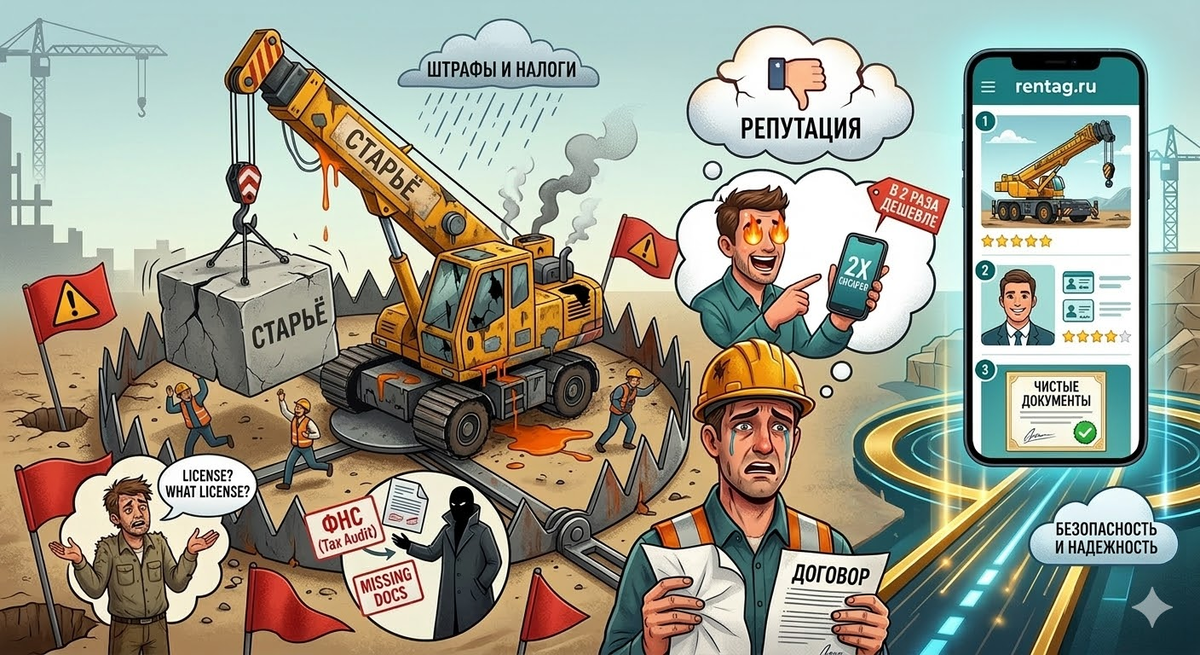 «Мы нашли кран в два раза дешевле рынка!» — радостно сообщает менеджер. Глаза горят, бюджет сэкономлен, все молодцы. А через неделю на объекте начинается ад: техника ломается, водитель опаздывает, документы «забыли», а вместо обещанного 25-тонника приезжает 20-тонный «близнец», который ничего не поднимает. Знакомая история? К сожалению, на рынке аренды спецтехники низкая цена — это почти всегда красный флаг. Мы в rentag.ru видим тысячи сделок и знаем, чем на самом деле оборачивается погоня за дешевизной. В этой статье разберём скрытые расходы, которые гарантированно (ну, или с вероятностью 99%) превратят вашу «экономию» в убытки. Самый очевидный риск. Низкая цена часто означает, что технике 20 лет, она прошла «семь кругов ада», а её ремонт поддерживается исключительно силой воли и изолентой. Вы заплатили за аренду 50 000 рублей вместо 80 000. Казалось бы, плюс 30 000 в кармане. Но если этот экскаватор встанет посреди рабочего дня: В лучшем случае вы потеряете всю «экономию» за один ден