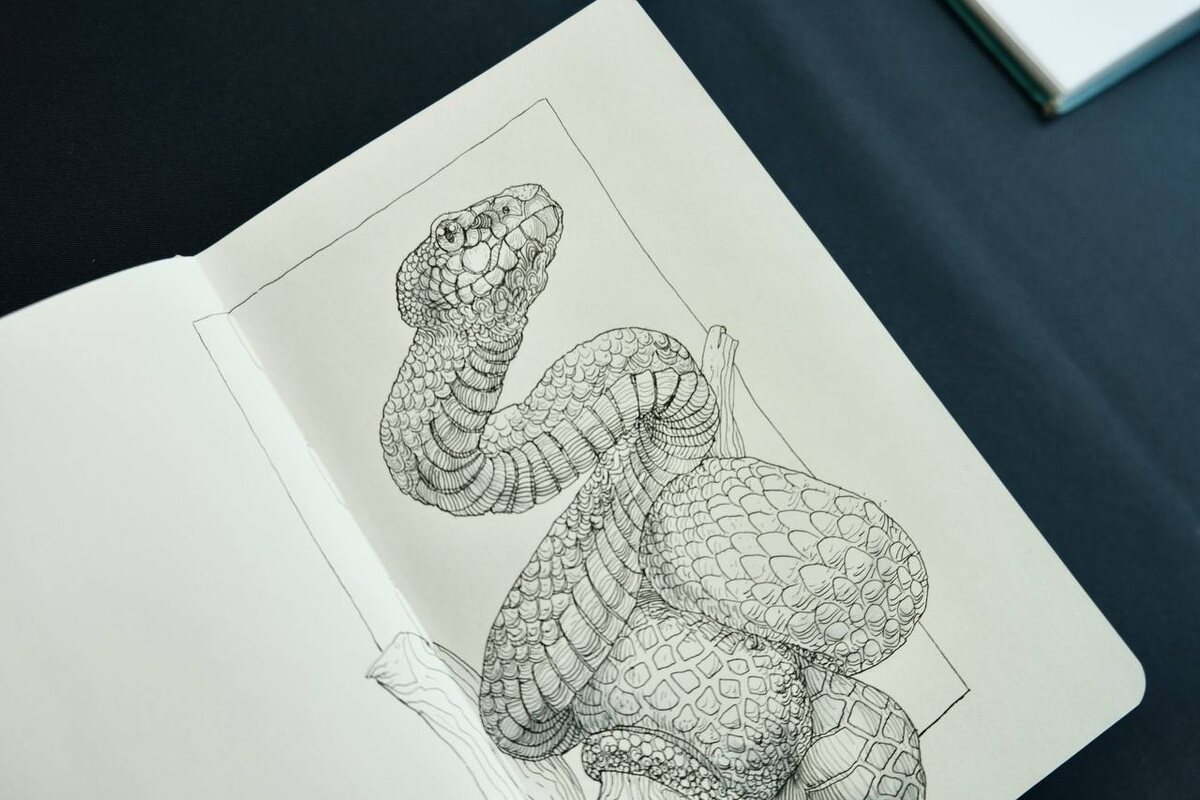 Многие могут насторожиться,всё-таки змея — не самый очевидный объект для скетчинга. Но как только мы начинаем работать с фактурой, всё меняется. У змеи невероятно красивая кожа: чешуйки, блики, мягкие переходы цвета. Это как маленький орнамент, который постепенно собирается в живую форму. меня всегда завораживают именно такие поверхности — где можно «зависнуть» на деталях и наблюдать, как из простых штрихов появляется фактура. 💫Поэтому в этом скетче мы сначала ловим плавную линию тела, а потом постепенно добавляем чешуйки, свет и тень. И, честно говоря, ученики всегда удивляются, насколько это увлекательно.