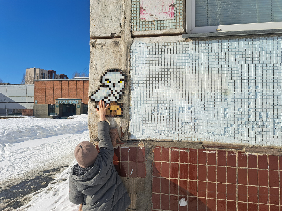 Сегодня предлагаю полюбоваться еще одной пиксельной подборкой. У нее есть один немаловажный плюс — все мозаики находятся по одному адресу, достаточно заглянуть на территорию одного новосибирского лицея. 🏫 Это не Хогвартс, но при входе в лицей вас встретит очаровательная СОВУШКА 🦉 с долгожданным конвертом 💌. 🤖 Буквально за углом — добродушный, заботливый медицинский робот БЭЙМАКС 🩺, персонаж анимационной вселенной Disney. 💛 Чуть дальше, у входа в лицей, — ЧЕРНЫЕ СОБОЛИ. Это одни из ключевых элементов герба Новосибирска. На официальном гербе они выступают в роли животных, которые поддерживают геральдический щит, здесь же в их лапках — большое желтое сердце. 🦉 С другой стороны — большая синяя ПТИЦА. 🎮 А дальше, в арке, — персонажи популярной когда-то игры «SUPER MARIO». Ну что, дети 90-х, ностальгия в глаз не попала? ⭐️ Обходим здание и видим у входа в танцевальную школу большую (самую крупную в этой коллекции) желтую ЗВЕЗДУ. 🐘 Во внутреннем дворике, справа за аркой, — почти непр