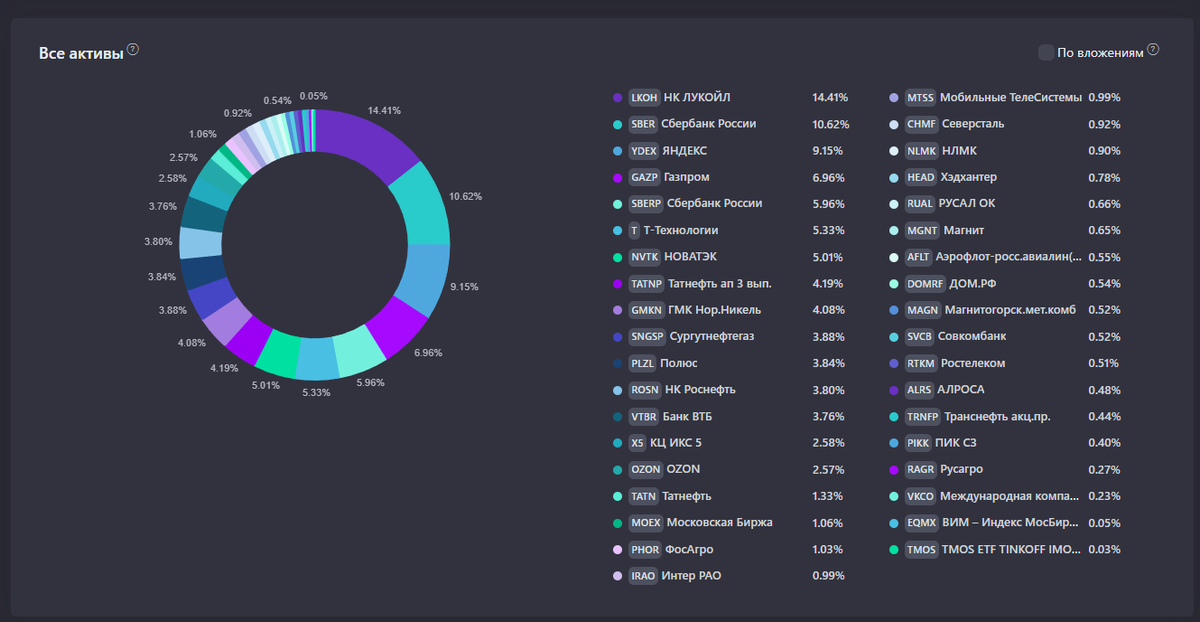 * Лукойл - 14,5% * Газпром - 7% * Татнефть - 5,5% * Новатэк - 5% * Сургутнефтегаз-п - 3,9% * Роснефть - 3,8% * Сбер - 16,6% * Т-Технологии - 5,3% * ВТБ - 3,7% * Мосбиржа - 1% * Дом-РФ - 0,6% * Совкомбанк - 0,5% * Норникель - 4,1% * Полюс - 3,8% * Фосагро - 1% * Северсталь - 0,9% * НЛМК - 0,9% * Русал - 0,7% * ММК - 0,5% * Алроса - 0,5% * Яндекс - 9,2% * OZON - 2,6% * Х5 - 2,6% * Магнит - 0,6% * Интер РАО - 1% * ХэдХантер - 0,8% * ПИК - 0,4% * Русагро - 0,3% * МТС - 1% * Ростелеком - 0,5% * ВК - 0,2% * Аэрофлот - 0,55% * Транснефть - 0,45% В информационных технологиях - только Яндекс. И то, решение спорное, т.к. поиск - это ближе к телеком и медиа по своей природе (бизнес - продажа рекламных площадей, как у телевидения). На самом деле, компаний много, но до попадания в мой портфель они не доросли. Так и живём: жижа да банки. С начала года +7%, есть надежды на хорошие результаты по итогам года (в отличие от предыдущих двух лет): Про коэффициенты (повышающие и понижающие) давно ничего не