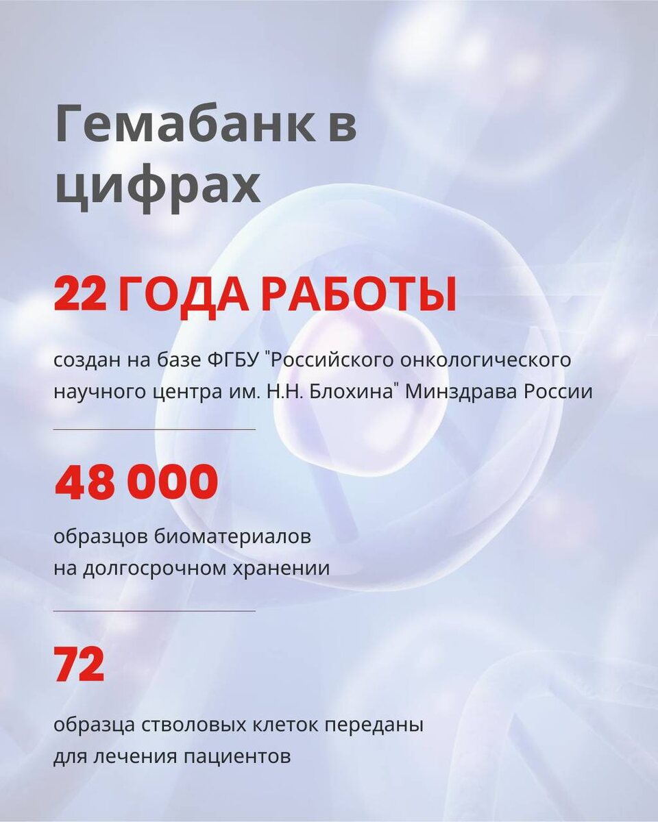 : ✅ Гемабанк был создан в 2003 году на базе ФГБУ "Российского онкологического научного центра им. Н.Н. Блохина" Минздрава России. ✅ За 22 года работы для лечения было передано 72 образца стволовых клеток пуповинной крови. Заготовленные образцы были переданы для трансплантаций в ведущие медицинские центры в РФ, США, Германии, Ю. Кореи, Грузии. Все трансплантации с применением образцов из Гемабанка прошли успешно, что доказывает высокое качество хранимого биоматериала в специализированных криохранилищах. ✅ В настоящее время в базе Гемабанка на долгосрочном персональном хранении находится более 48 000 образцов биоматериалов, включая образцы гемопоэтических стволовых клеток пуповинной крови (ГСК ПК), а также образцы мезенхимальных стволовых клеток (МСК) и ткани пупочного канатика. Для хранения биоматериала своего ребенка Гемабанк выбирают многие врачи, деятели науки, искусства, культуры и спорта. Если у вас возникли вопросы или вы хотите узнать больше, обращайтесь к нам — мы всегда р