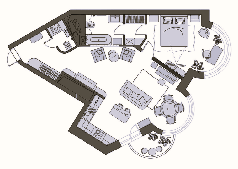 Архитектура квартиры задала нам несколько интересных задач. Дом построен в двухтысячных, и планировка здесь типична для того времени — сложная, с неожиданными углами и нюансами. В пространстве расположились два эркера: один украшает гостиную, второй — спальню. Эти архитектурные элементы сразу подсказали, как можно обыграть естественное освещение и создать визуальные акценты в ключевых зонах.